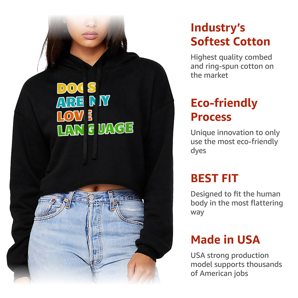 Dogs Are My Love Language Women’s Cropped Hoodie is proudly made with 7x less water than average manufacturers, in recycle-friendly facilities that also guarantee zero sweatshop conditions. Funny Dog Women’s Cropped Hoodie is designed and printed in California.