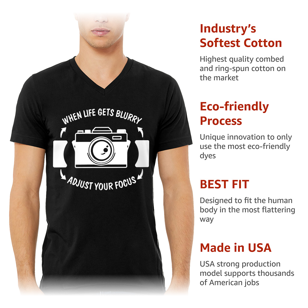 When Life Gets Blurry Adjust Your Focus V-Neck T-Shirt is proudly made with 7x less water than average manufacturers, in recycle-friendly facilities that also guarantee zero sweatshop conditions