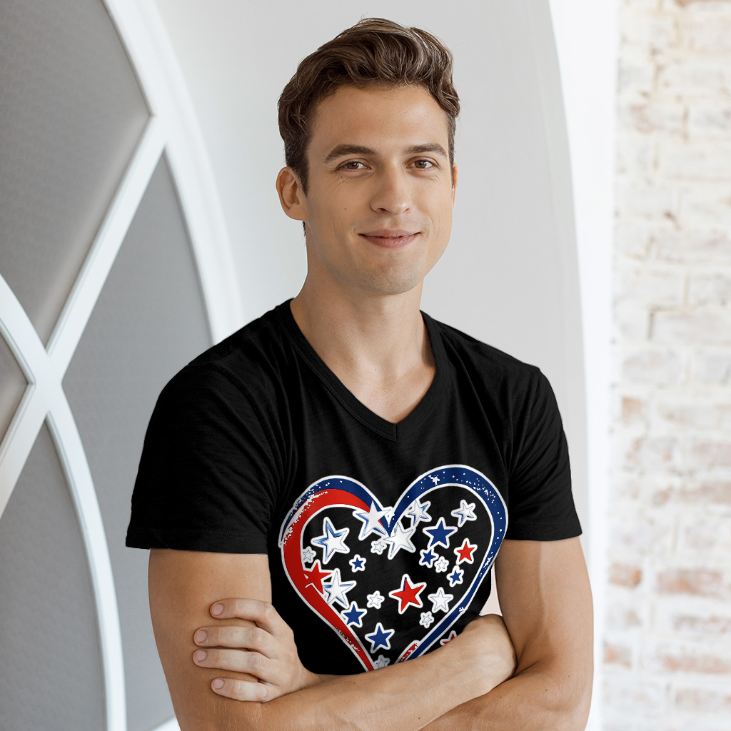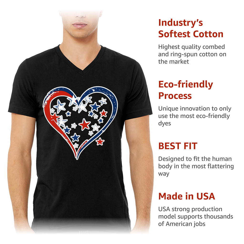 Red White Blue Heart V-Neck T-Shirt is proudly made with 7x less water than average manufacturers, in recycle-friendly facilities that also guarantee zero sweatshop conditions