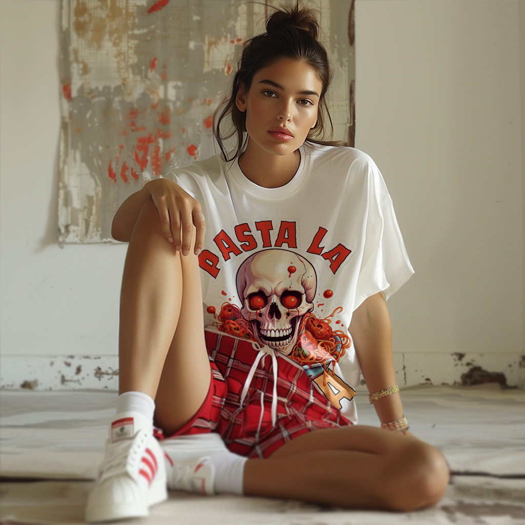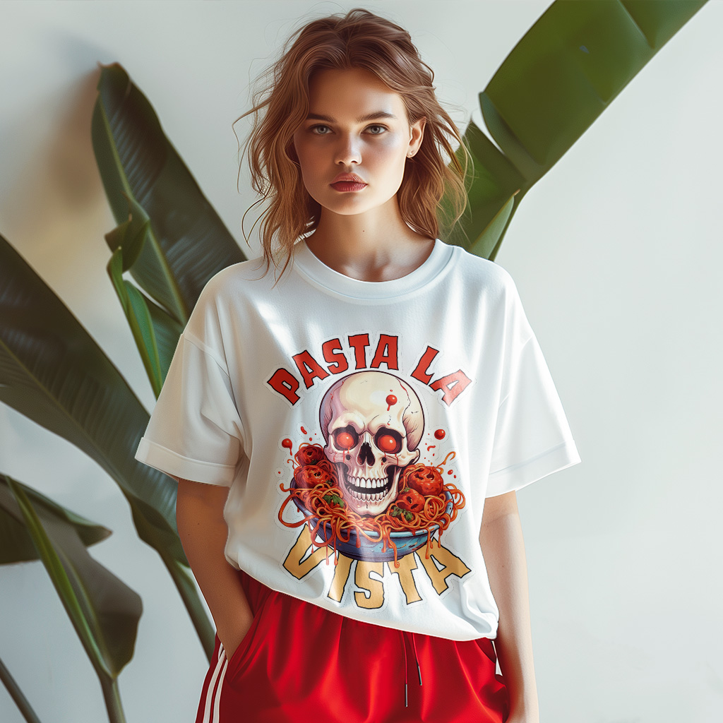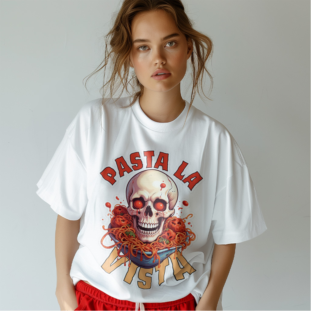 Pasta La Vista T-Shirt is no ordinary piece of clothing. Its taped neck and shoulders, double-needle sleeve and bottom hems, and quarter-turned construction provide a retail fit for clothing that’s true to size. Food Pun Heavy Cotton Tee is Designed and printed in California.