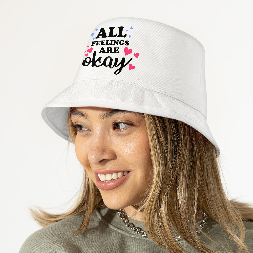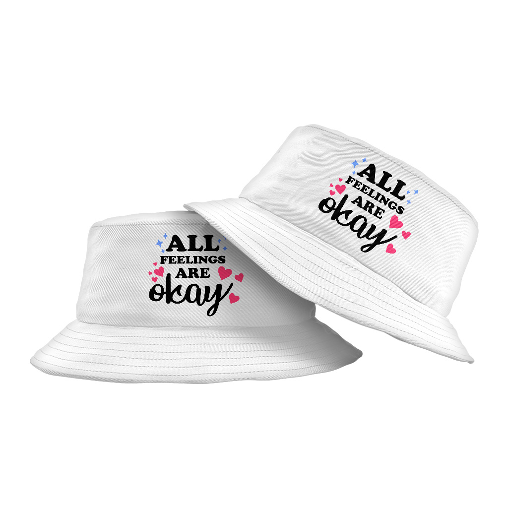 Made from 100% polyester. All Feelings Are Okay Bucket Hat is made for men and women.