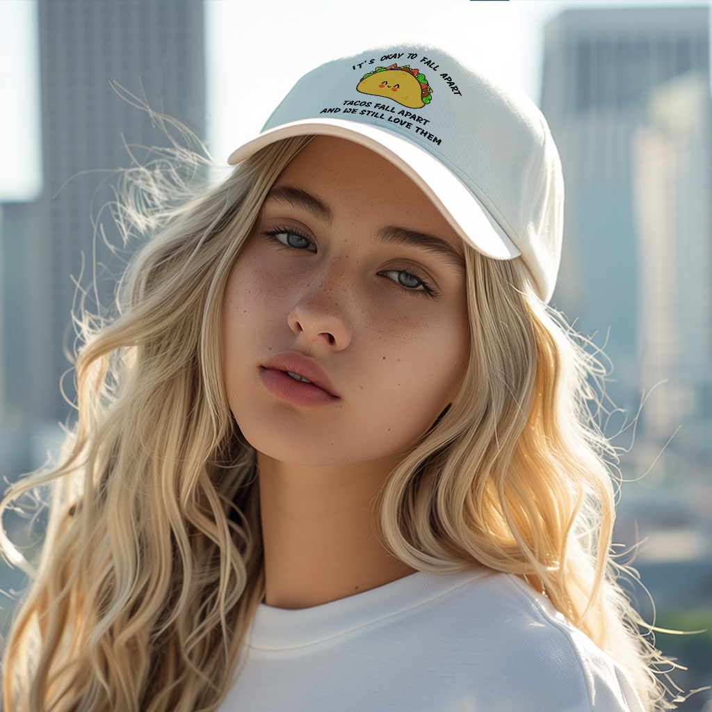 The cap features a self-fabric hideaway strap with antique brass buckle and grommet so it can be adjusted for the perfect fit