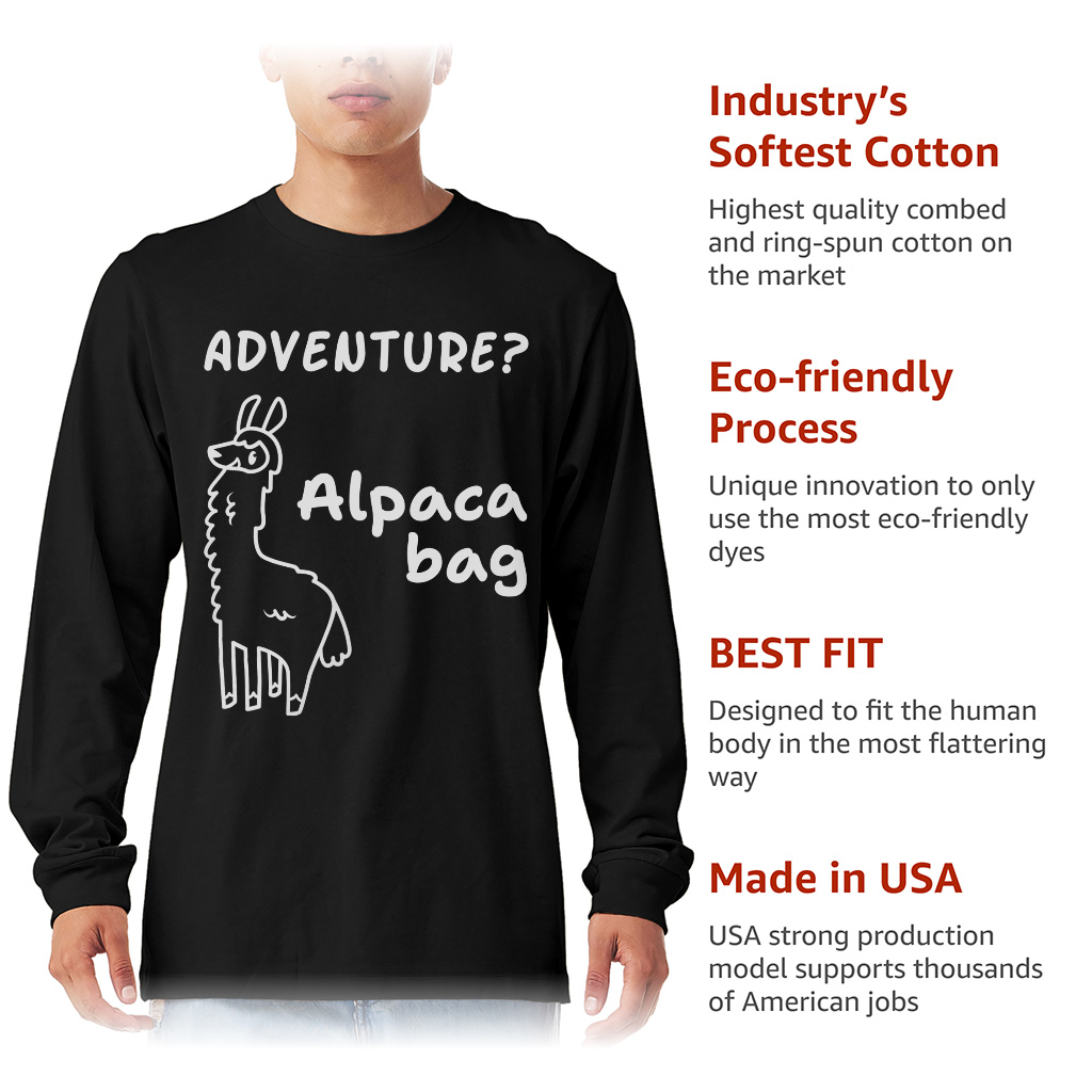 Adventure Alpaca Bag Long Sleeve T-Shirt is proudly made with 7x less water than average manufacturers, in recycle-friendly facilities that also guarantee zero sweatshop conditions. Funny Pun T-Shirt is designed and printed in California.