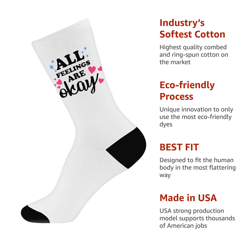 Cushioned foot bottom makes All Feelings Are Okay Unisex Socks a sure bet for everyday wear, from work, play, gym, sports, and beyond. These socks are designed to be all-season. This product is made breathable for when it’s warm but thick enough for when it’s cold during the winter.