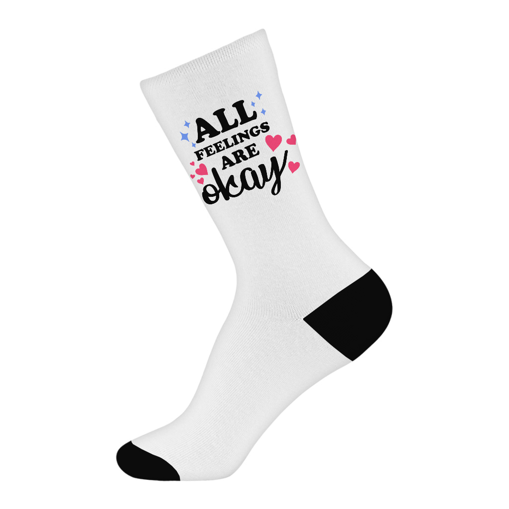 Cushioned foot bottom makes All Feelings Are Okay Unisex Socks a sure bet for everyday wear, from work, play, gym, sports, and beyond. These socks are designed to be all-season. This product is made breathable for when it’s warm but thick enough for when it’s cold during the winter.