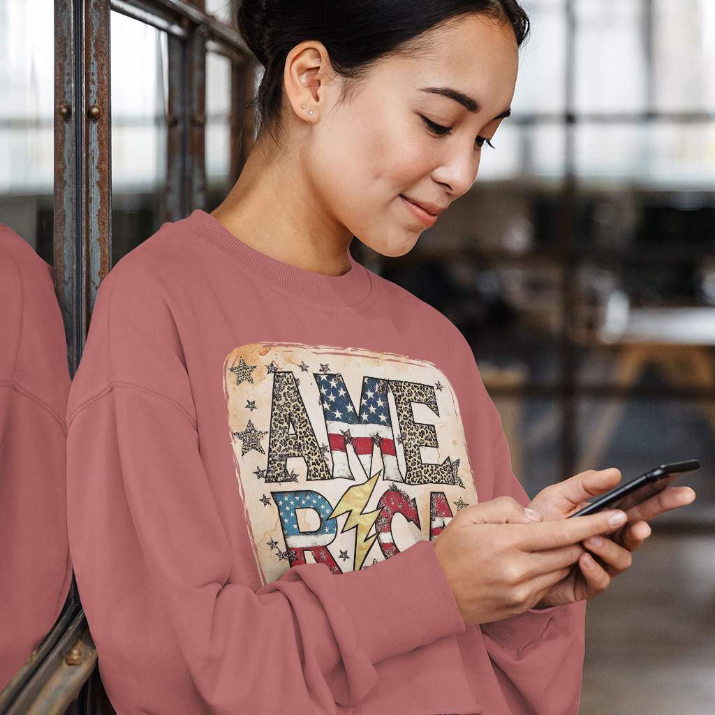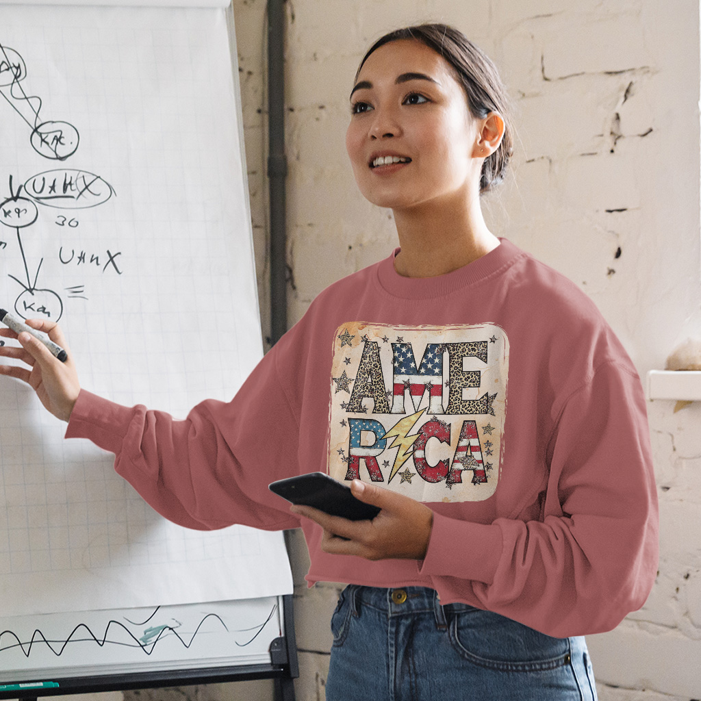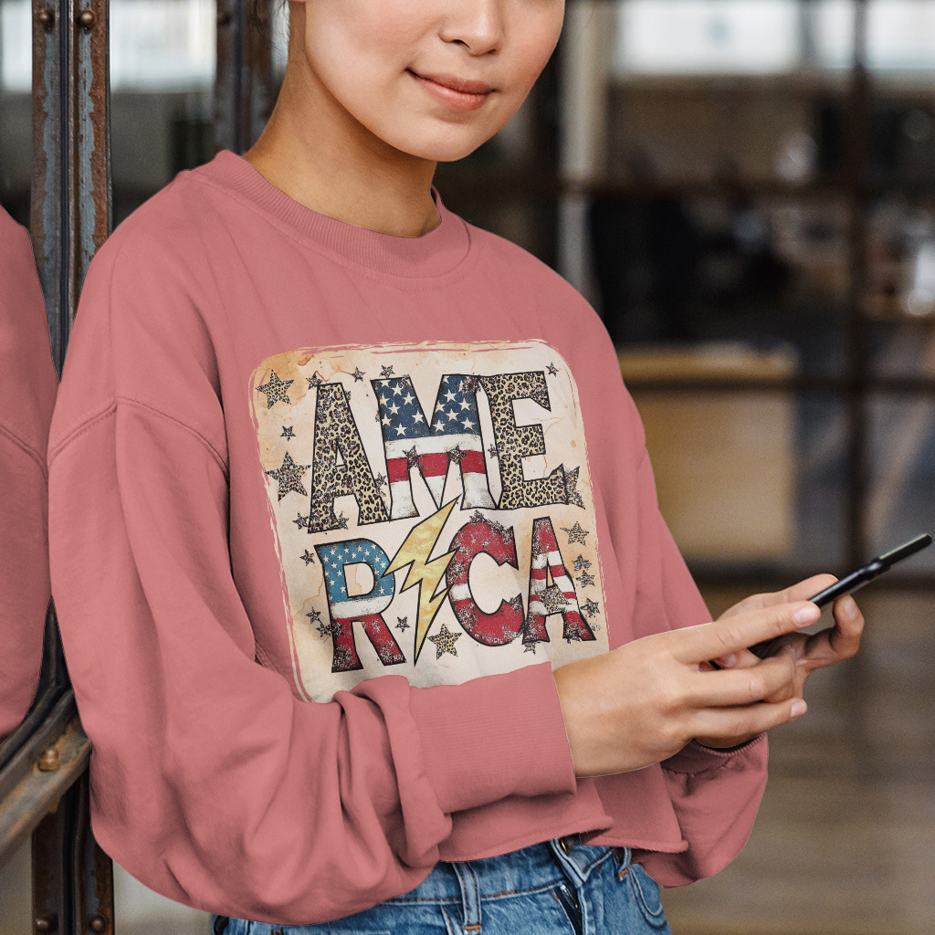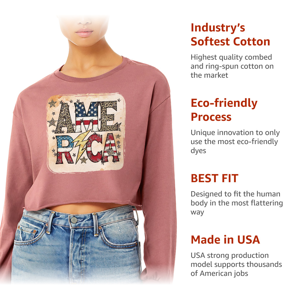 America Graphic Cropped Long Sleeve Sweatshirt – Retro Design Women’s Crop Top – Independence Day Long Sleeves Pullover