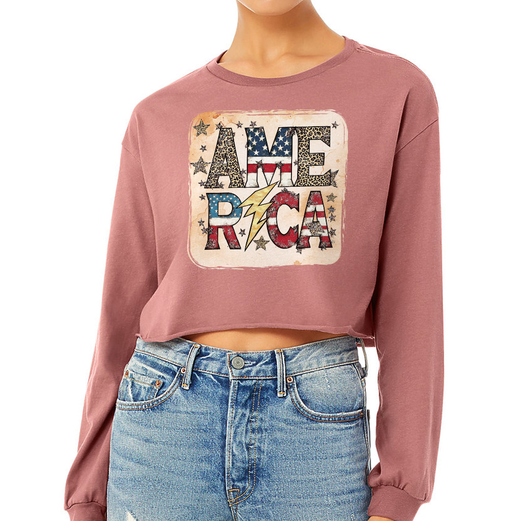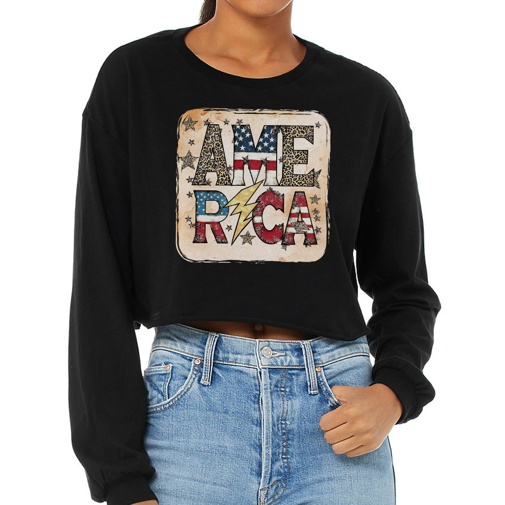 America Graphic Cropped Long Sleeve Sweatshirt – Retro Design Women’s Crop Top – Independence Day Long Sleeves Pullover