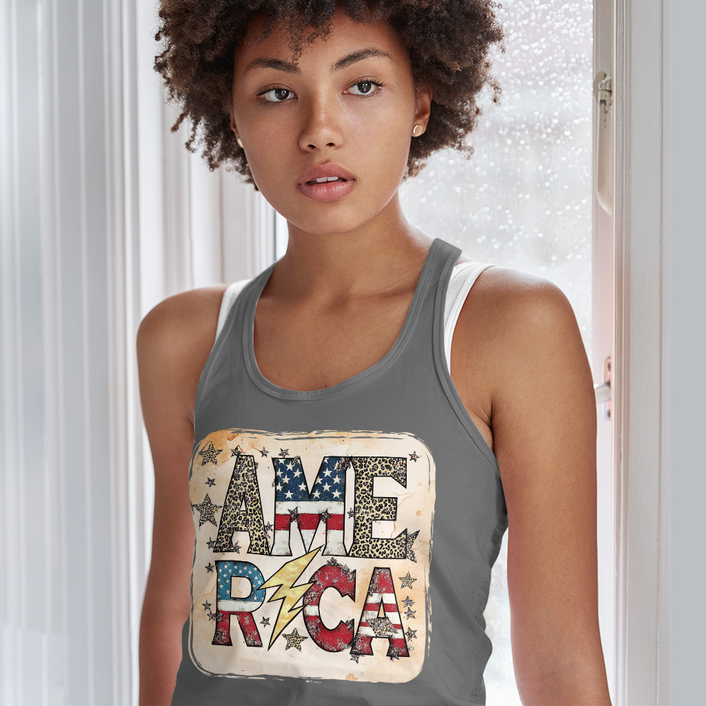 America Graphic Racerback Tank is no ordinary piece of clothing. Its side-seamed detail and flatlock-finished hems provide a retail fit for clothing that’s true to size.