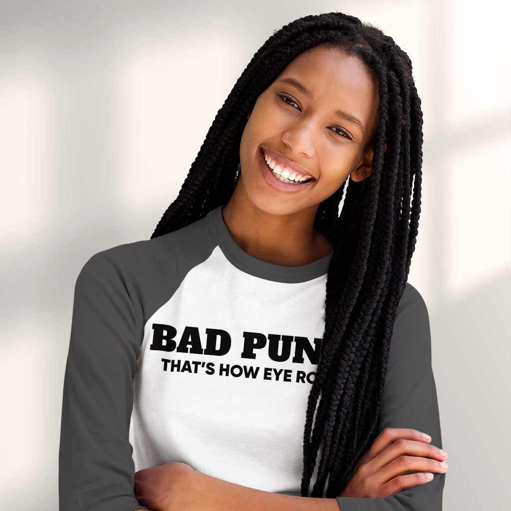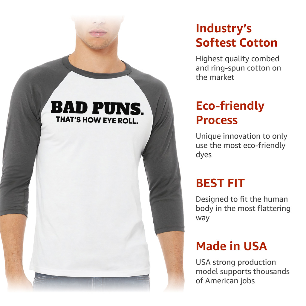 Bad Puns That’s How Eye Roll Baseball T-Shirt is proudly made with 7x less water than average manufacturers, in recycle-friendly facilities that also guarantee zero sweatshop conditions. Funny Joke 3/4 Sleeve is designed and printed in California.