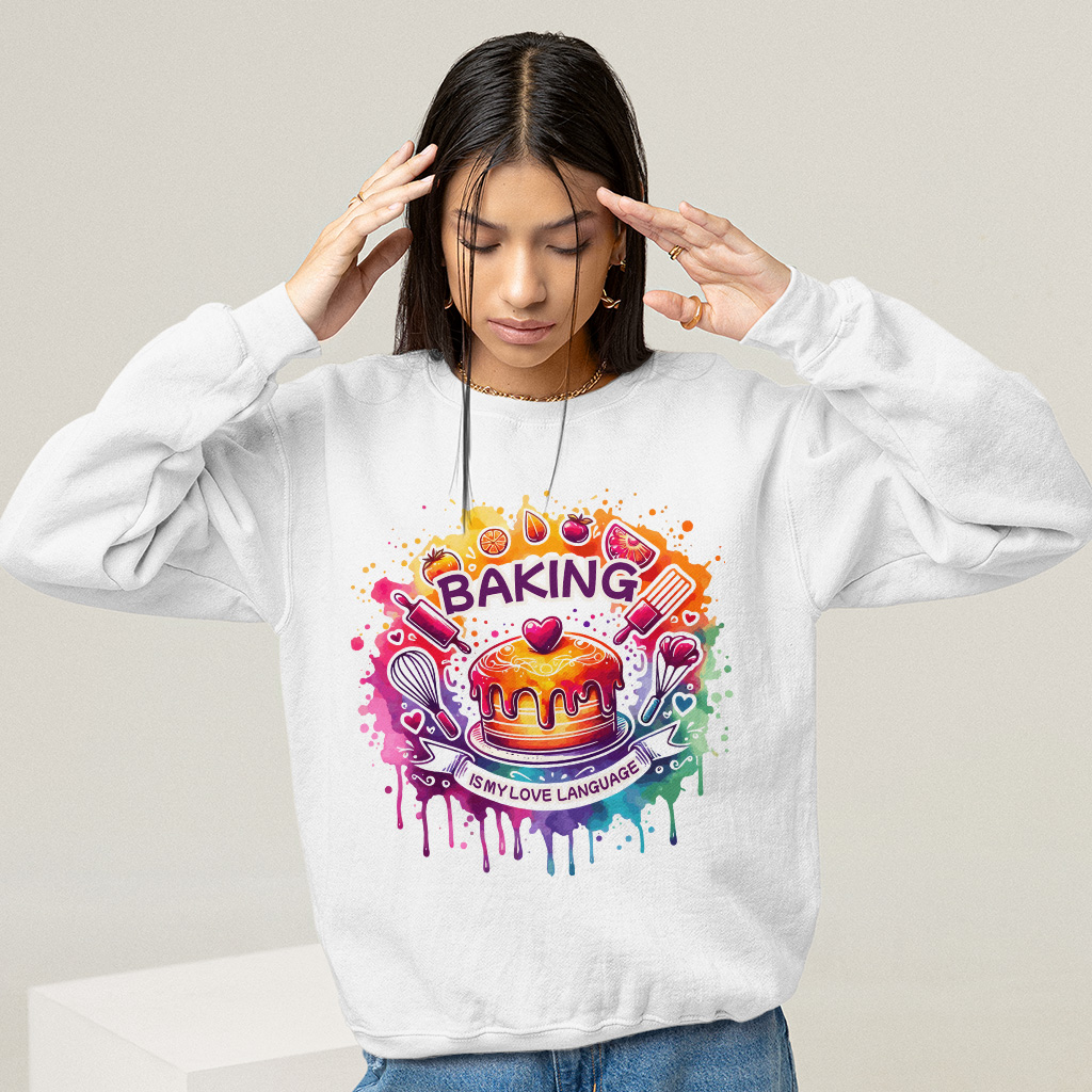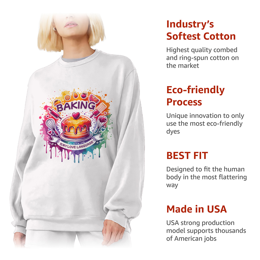 Baking Is My Love Language Sweatshirt is made from a 50% U.S. Cotton/50% Polyester blend, this warm 8.0 oz sq/yd classic fit style looks great and makes a great canvas for decorating. Baking Is My Love Language Sweatshirt is designed and printed in California.