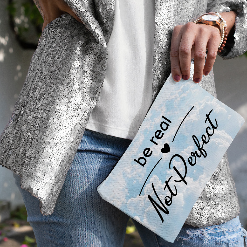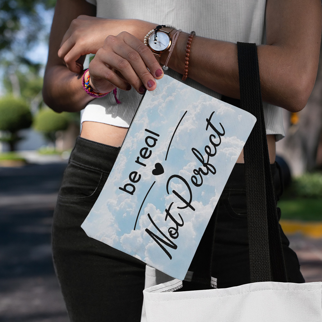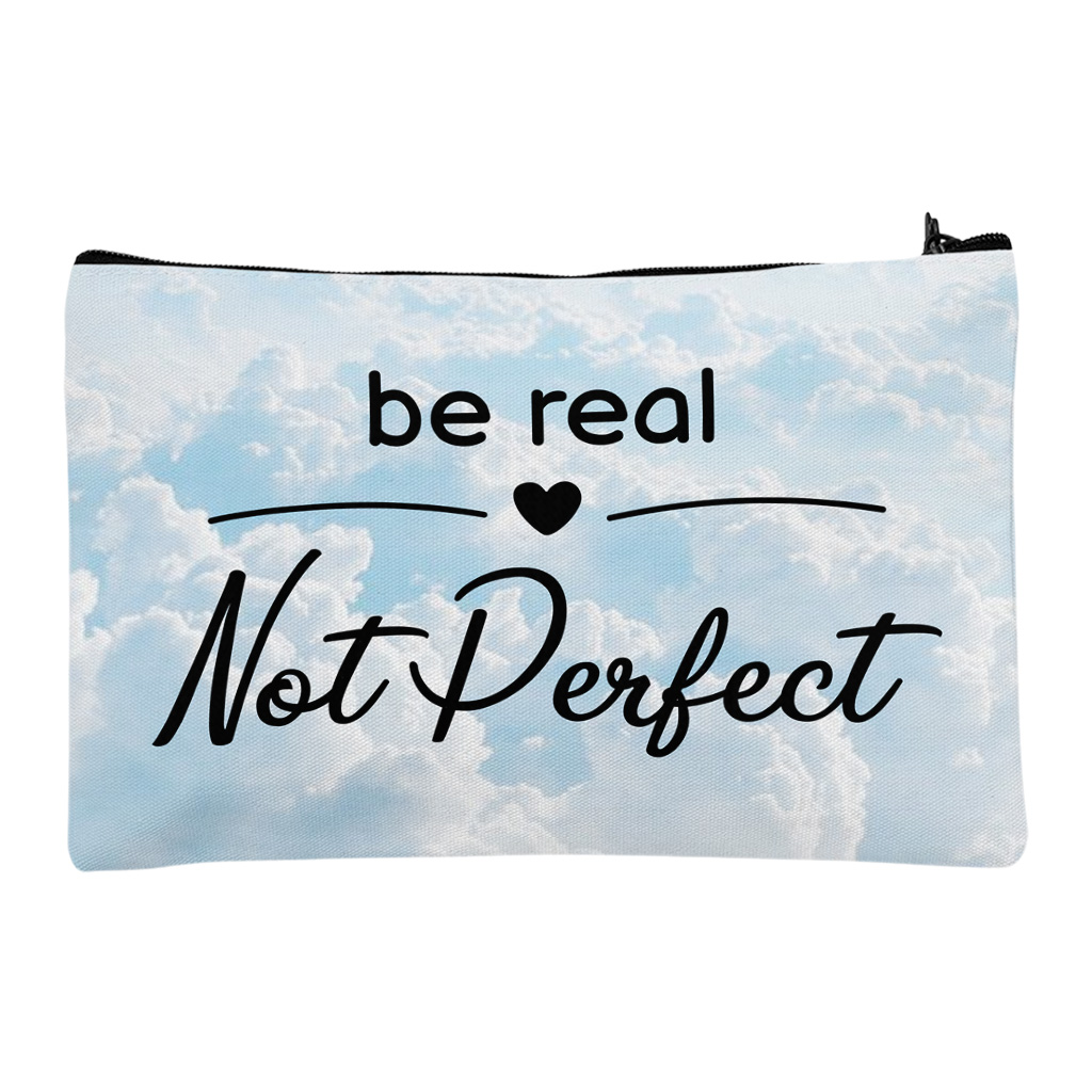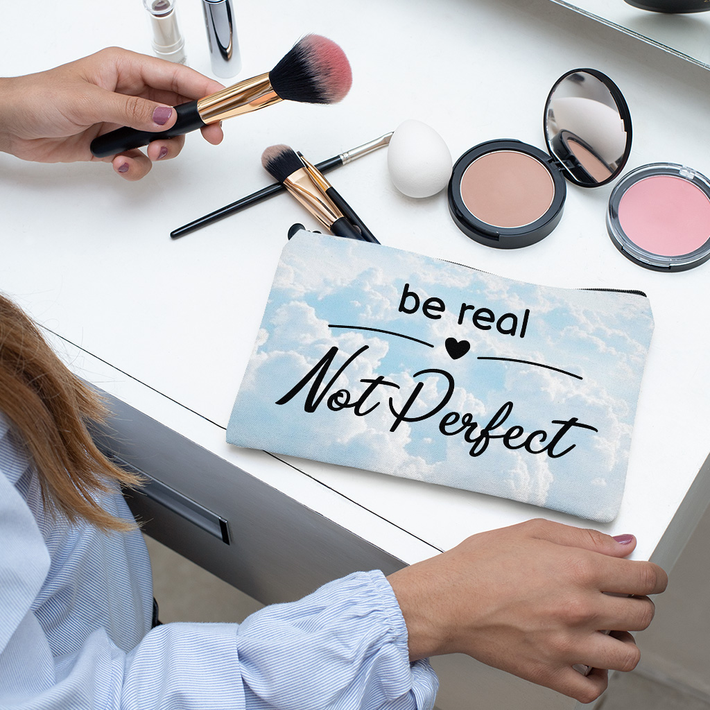 Be Real Not Perfect Travel Makeup Bag is made of 100% Spun polyester and equipped with a high-quality zipper, the cosmetic bag is easy to clean and well protects things inside from getting wet. Care: Spot clean with mild soap and water.