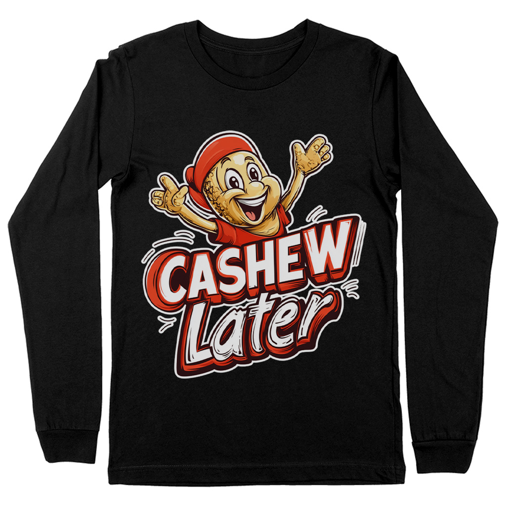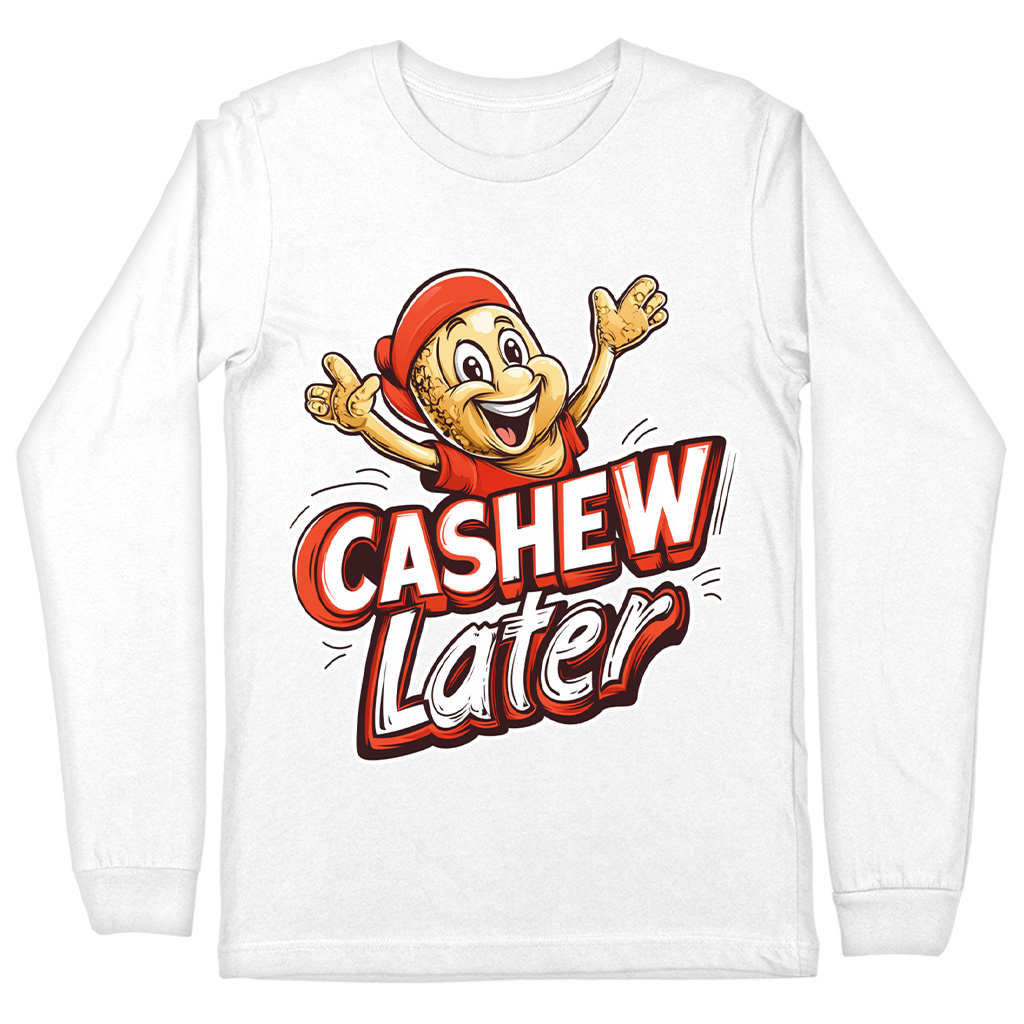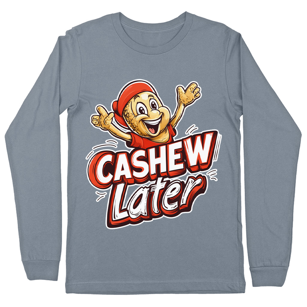Cashew Later Long Sleeve T-Shirt is proudly made with 7x less water than average manufacturers, in recycle-friendly facilities that also guarantee zero sweatshop conditions. Funny Cashew T-Shirt is designed and printed in California.
