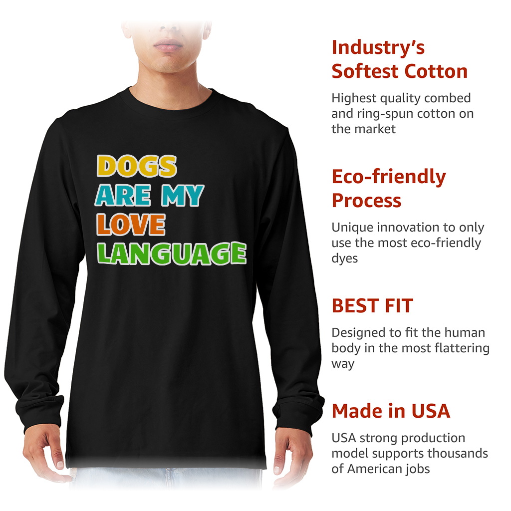 Dogs Are My Love Language Long Sleeve T-Shirt is proudly made with 7x less water than average manufacturers, in recycle-friendly facilities that also guarantee zero sweatshop conditions. I Love Dogs T-Shirt is designed and printed in California.