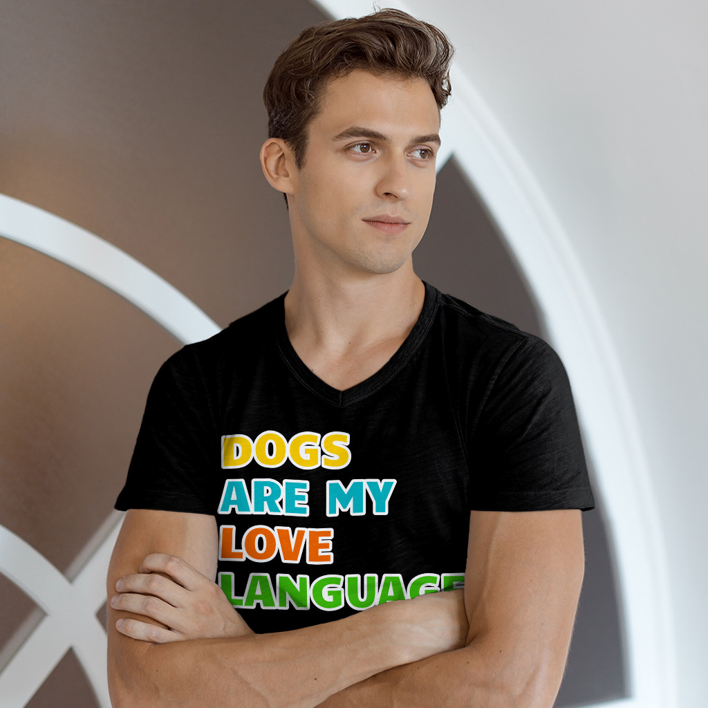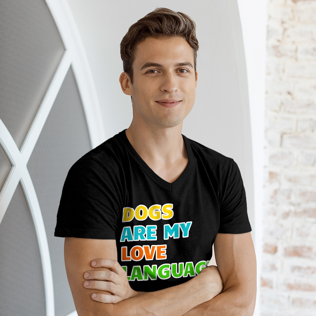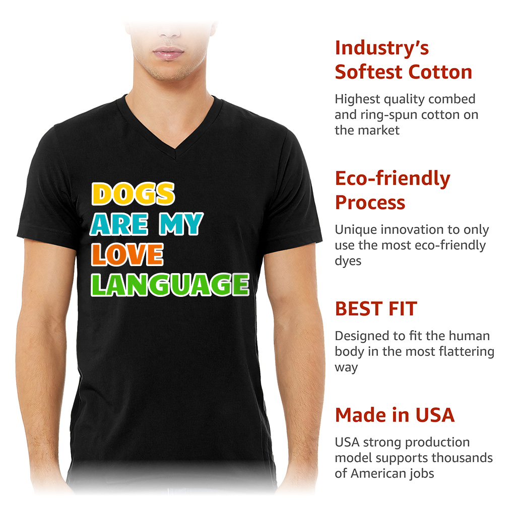 Dogs Are My Love Language V-Neck T-Shirt is proudly made with 7x less water than average manufacturers, in recycle-friendly facilities that also guarantee zero sweatshop conditions
