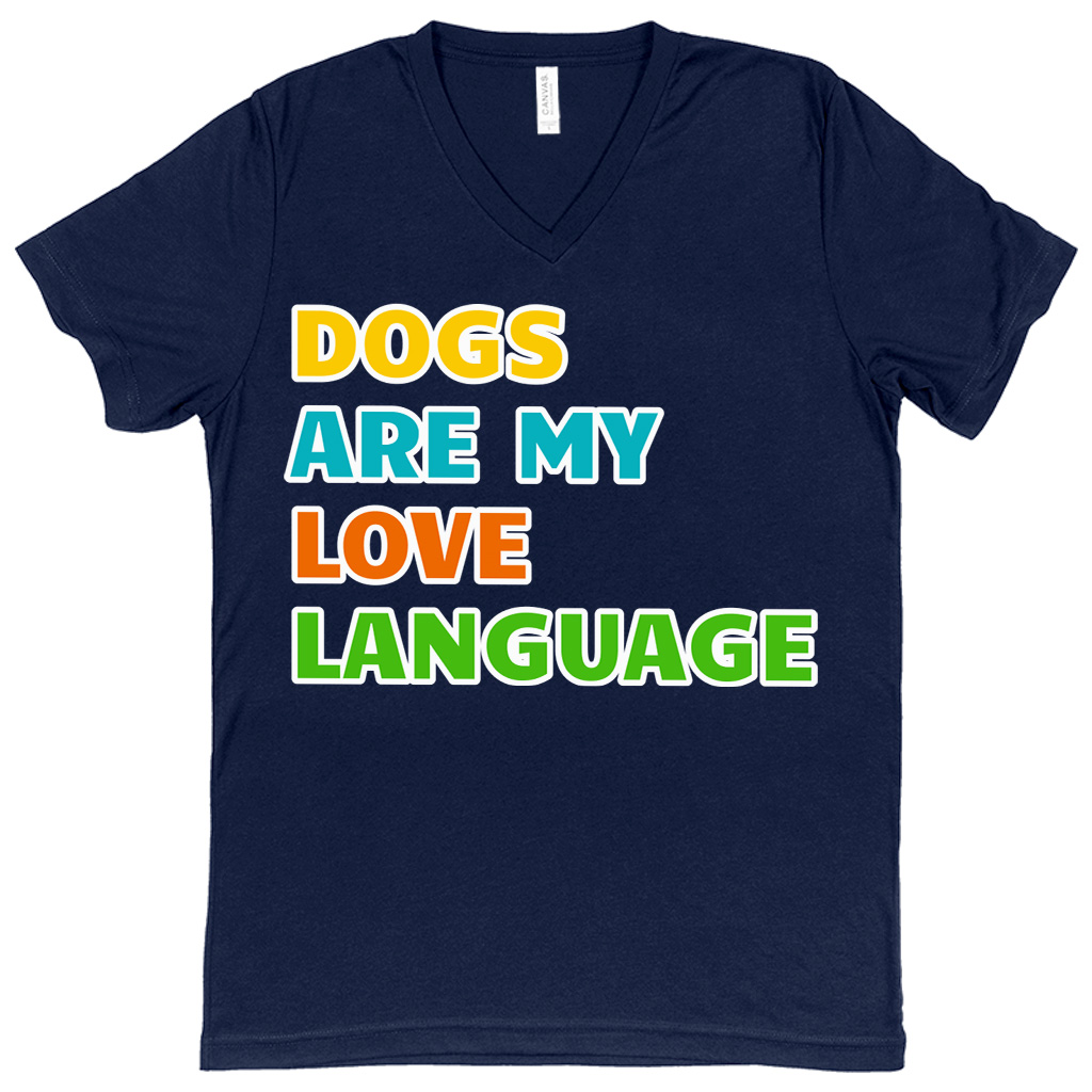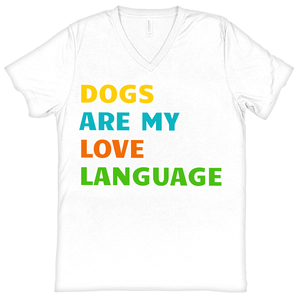 Dogs Are My Love Language V-Neck T-Shirt is proudly made with 7x less water than average manufacturers, in recycle-friendly facilities that also guarantee zero sweatshop conditions