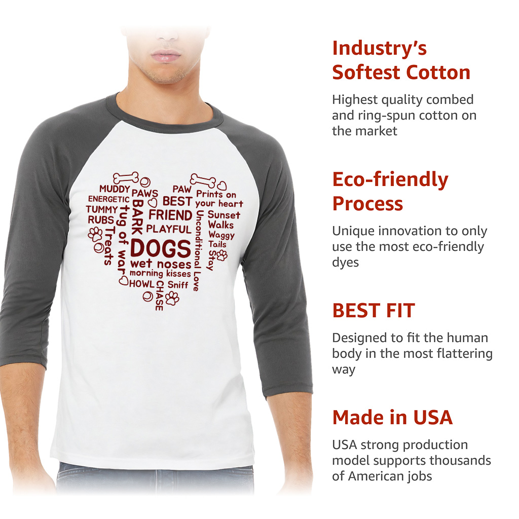 Dogs Words in Heart Baseball T-Shirt is proudly made with 7x less water than average manufacturers, in recycle-friendly facilities that also guarantee zero sweatshop conditions. Dog Owner 3/4 Sleeve is designed and printed in California.