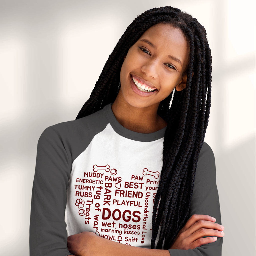 Dogs Words in Heart Baseball T-Shirt – Dog Owner 3/4 Sleeve – Gift for Dog Parent Raglan Jersey Shirt