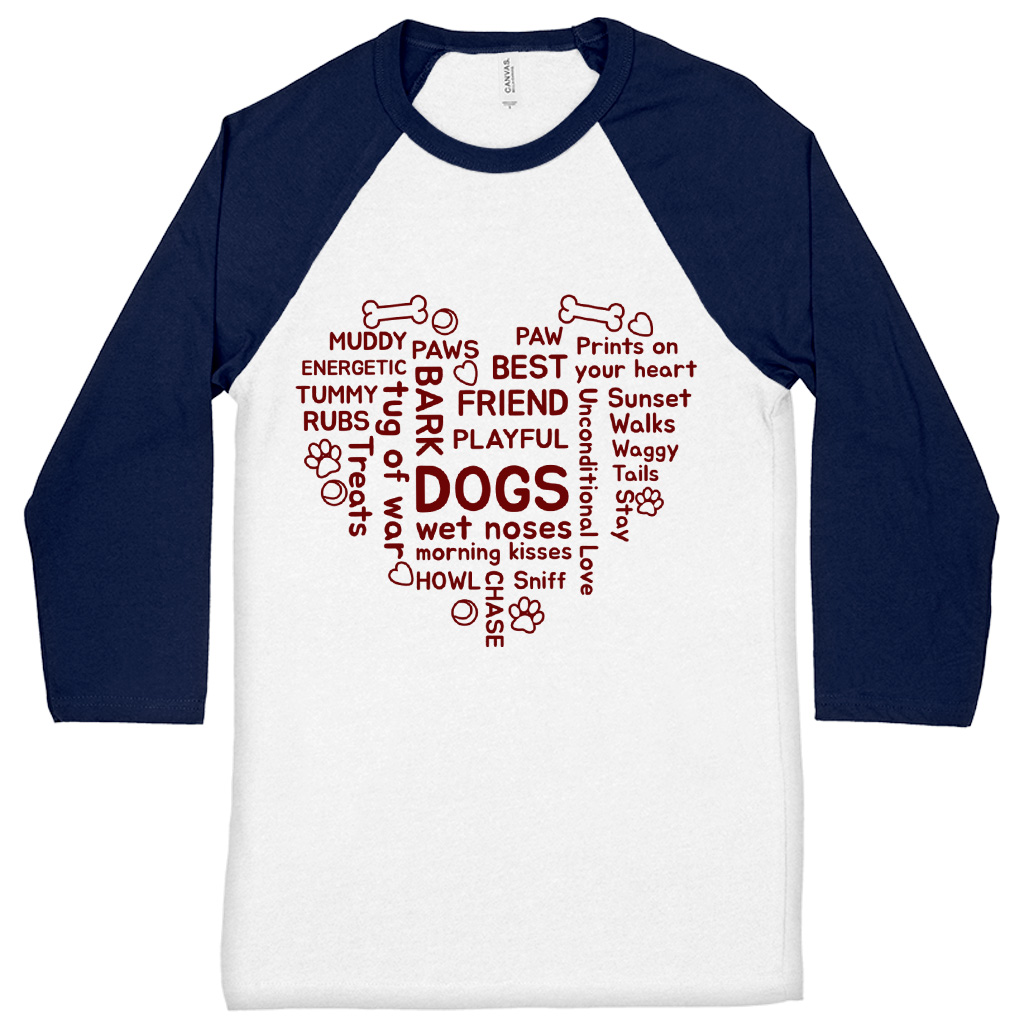 Dogs Words in Heart Baseball T-Shirt – Dog Owner 3/4 Sleeve – Gift for Dog Parent Raglan Jersey Shirt