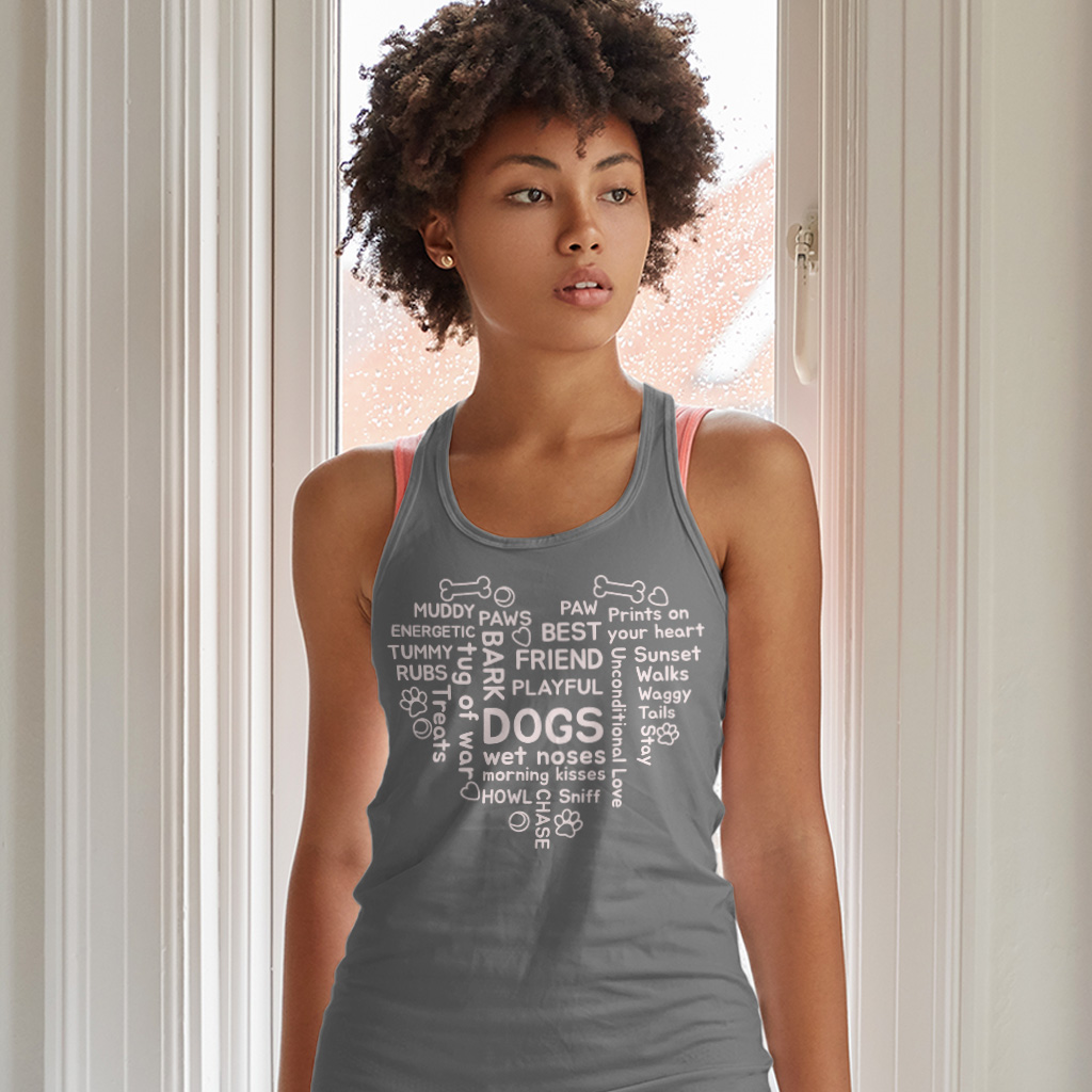 Dogs Words in Heart Racerback Tank is no ordinary piece of clothing. Its side-seamed detail and flatlock-finished hems provide a retail fit for clothing that’s true to size.