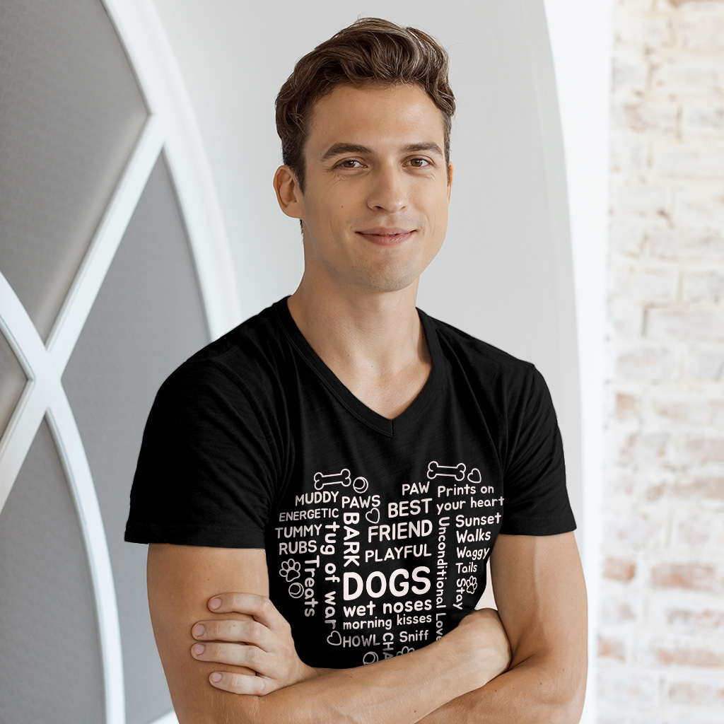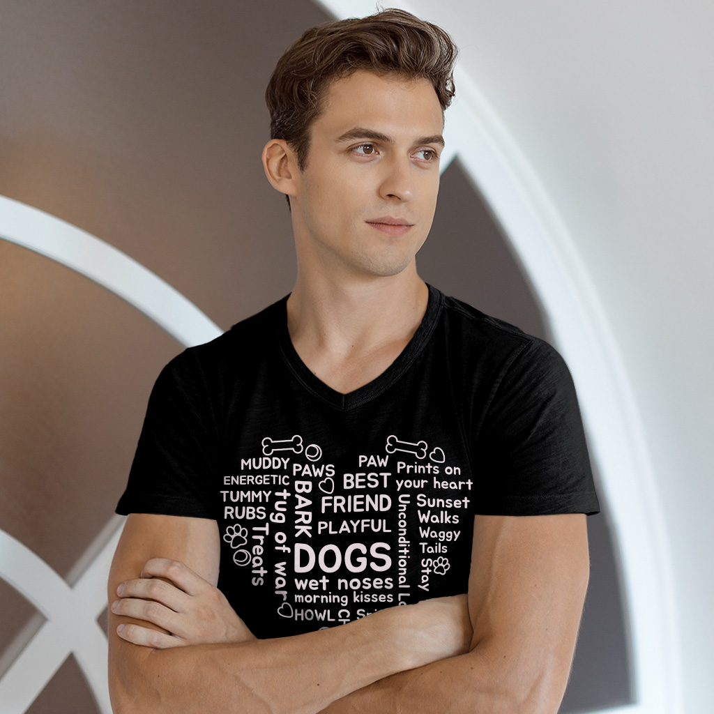 Dogs Words in Heart V-Neck T-Shirt is proudly made with 7x less water than average manufacturers, in recycle-friendly facilities that also guarantee zero sweatshop conditions