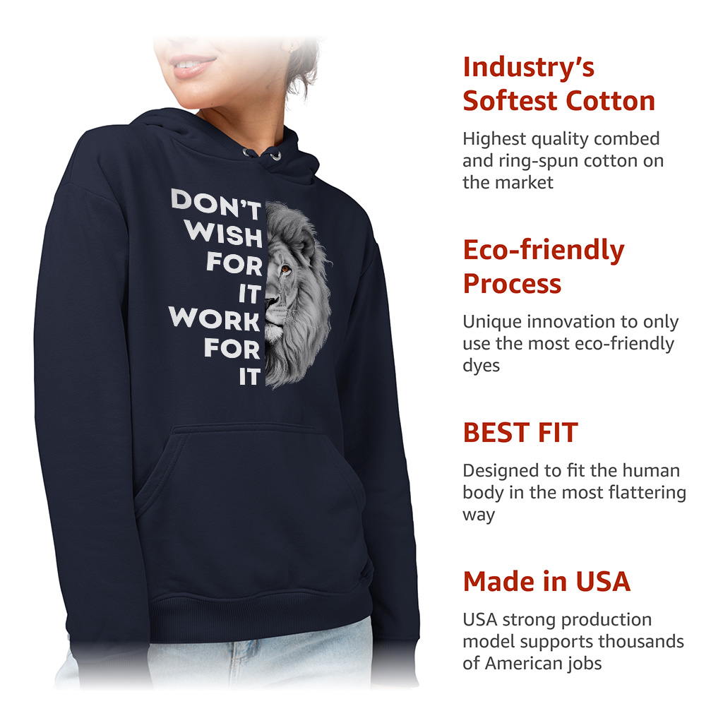 Don’t Wish for It Work for It Hoodie is proudly made with 7x less water than average manufacturers, in recycle-friendly facilities that also guarantee zero sweatshop conditions. Don’t Wish for It Work for It Hoodie is Designed and printed in California.