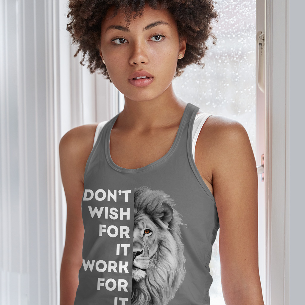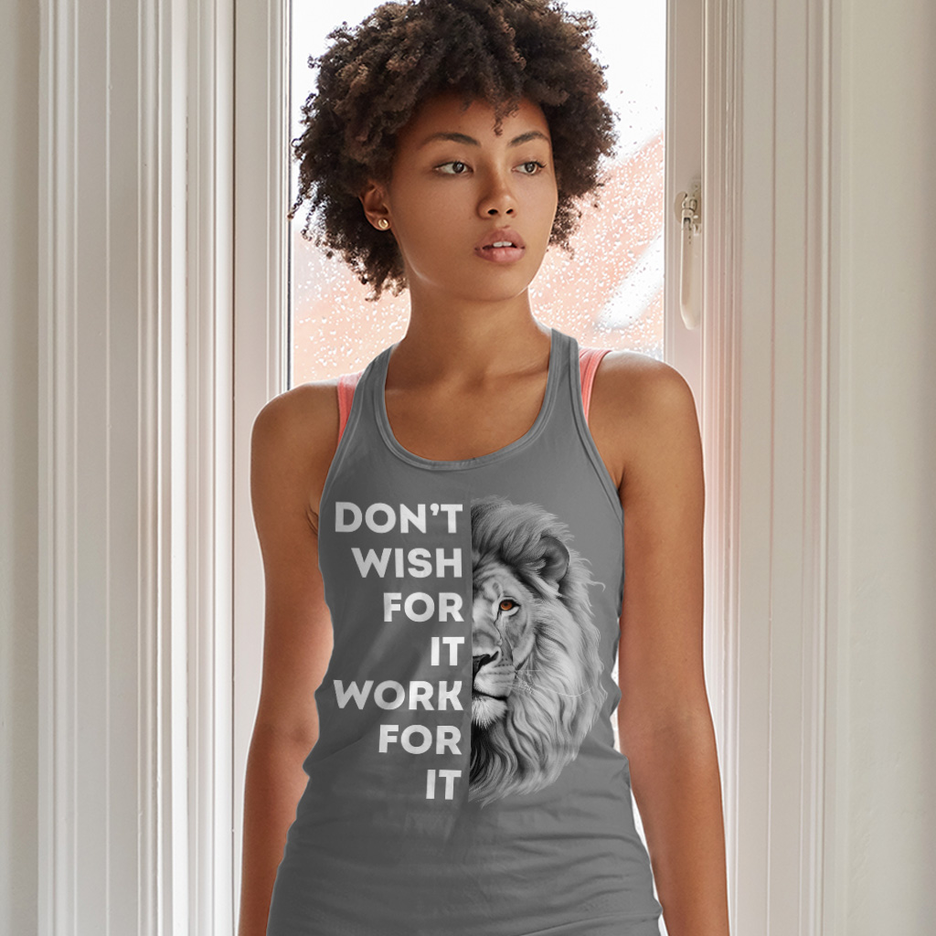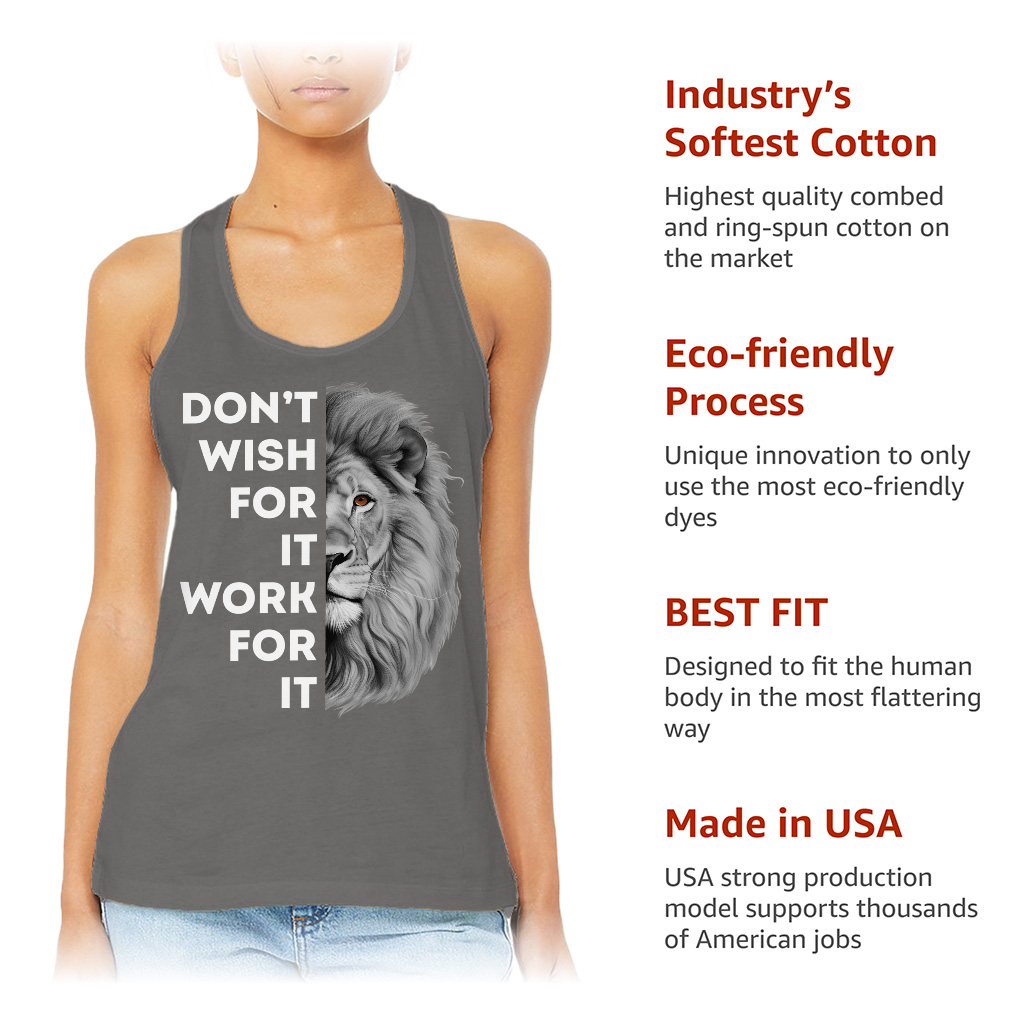 Don’t Wish for It Work for It Racerback Tank is no ordinary piece of clothing. Its side-seamed detail and flatlock-finished hems provide a retail fit for clothing that’s true to size.