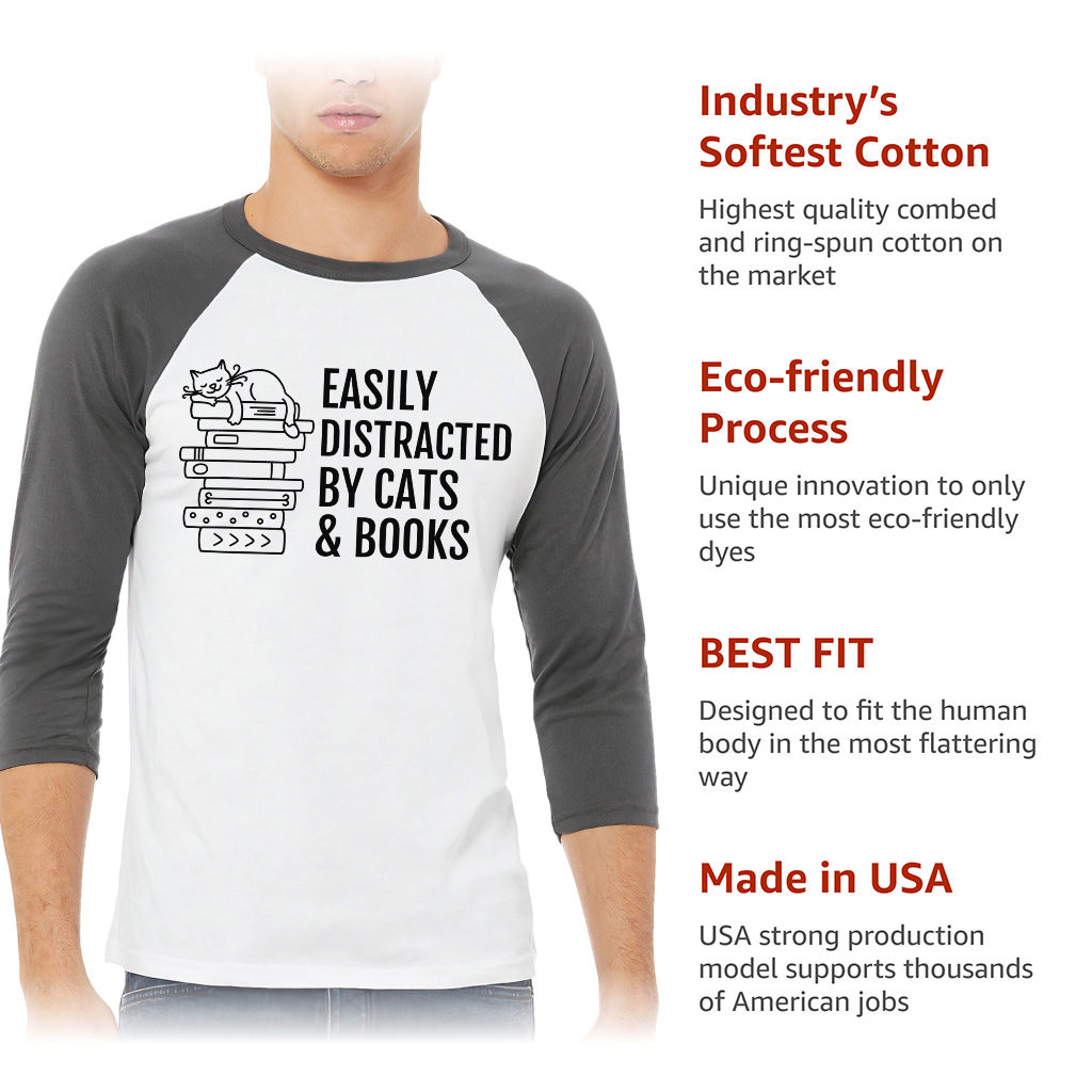 Easily Distracted By Cats And Books Baseball T-Shirt is proudly made with 7x less water than average manufacturers, in recycle-friendly facilities that also guarantee zero sweatshop conditions. Cats and Books 3/4 Sleeve is designed and printed in California.