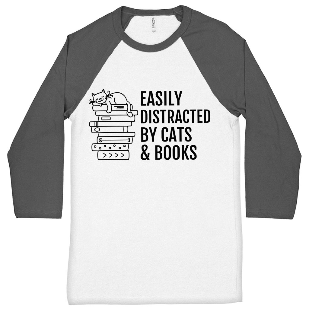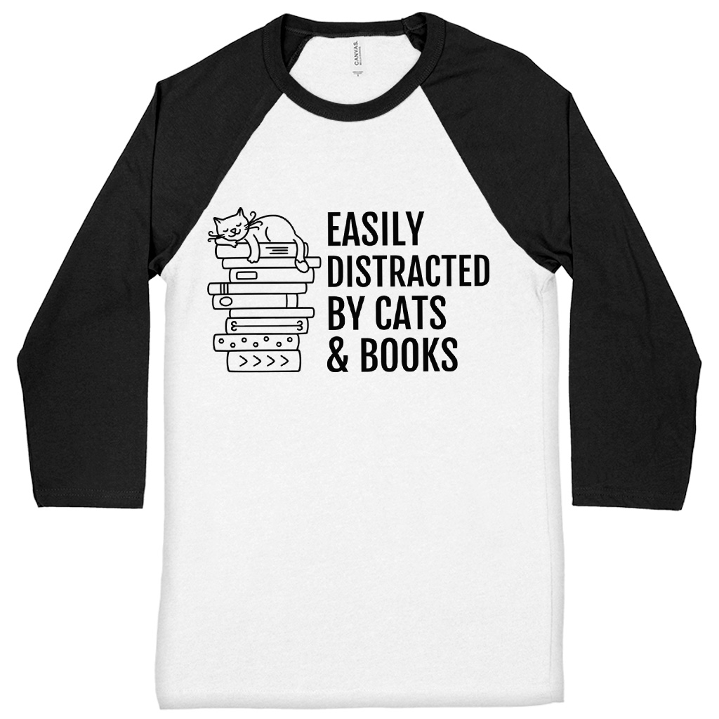 Easily Distracted By Cats And Books Baseball T-Shirt – Cats and Books 3/4 Sleeve – Book Lover Raglan Jersey Shirt