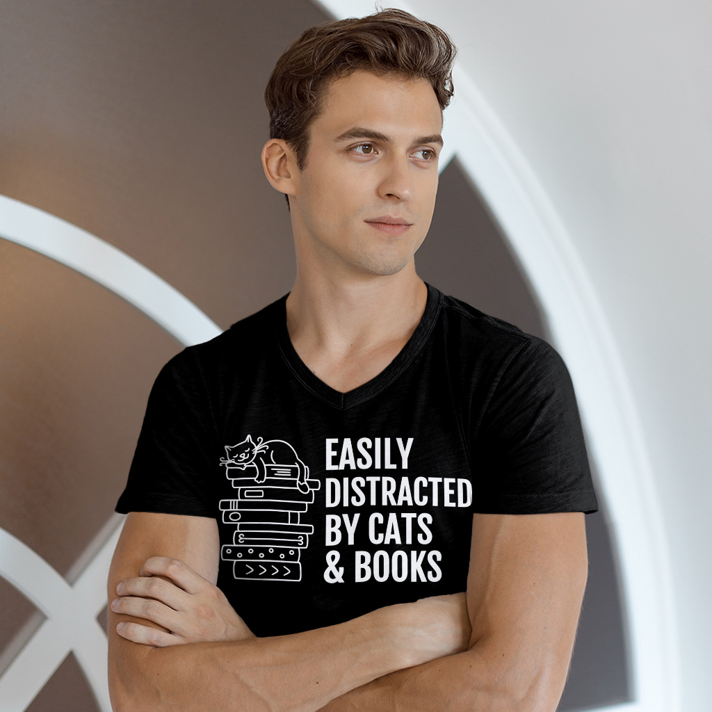Easily Distracted By Cats And Books V-Neck T-Shirt – Book Lover Basic T-Shirt – Cats and Books Tee