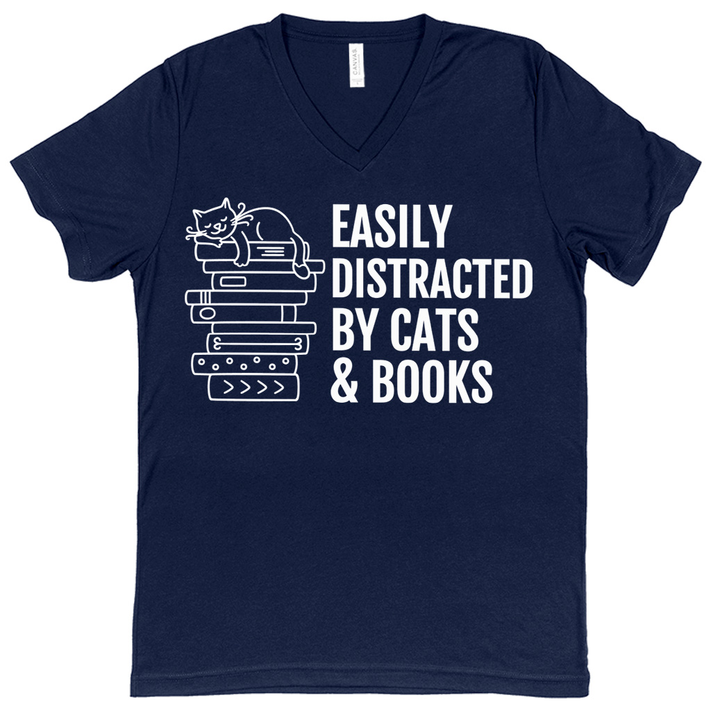 Easily Distracted By Cats And Books V-Neck T-Shirt – Book Lover Basic T-Shirt – Cats and Books Tee