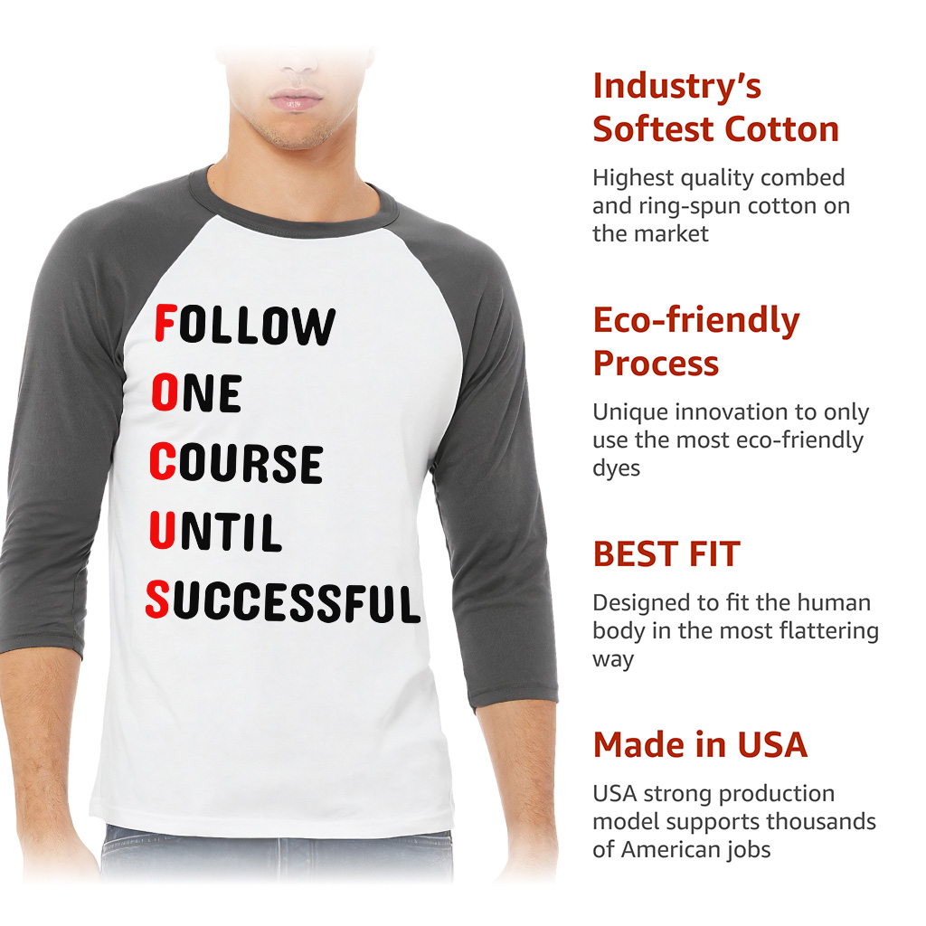 Focus Word Art Baseball T-Shirt is proudly made with 7x less water than average manufacturers, in recycle-friendly facilities that also guarantee zero sweatshop conditions. Success Mindset 3/4 Sleeve is designed and printed in California.