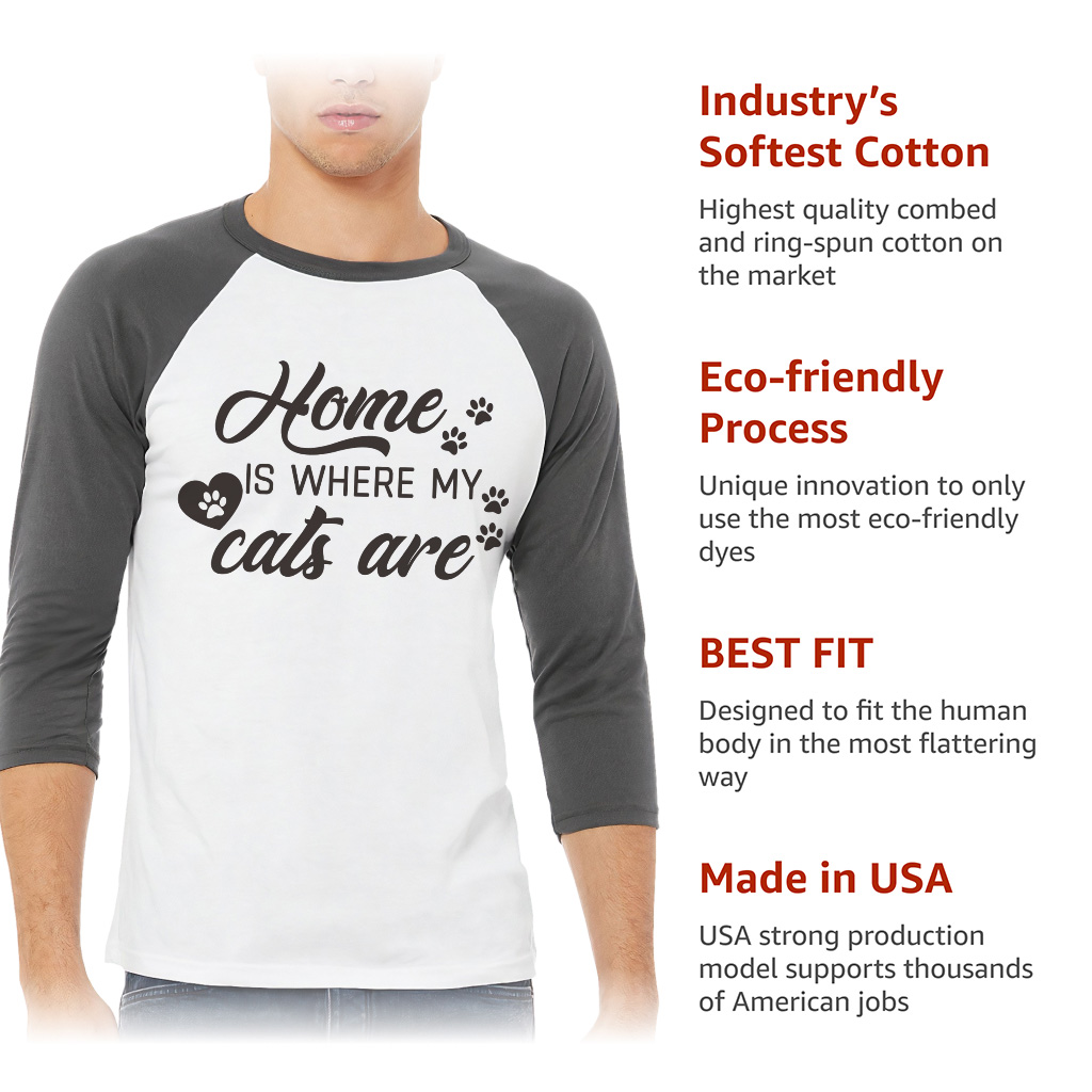Home Is Where My Cats Are Baseball T-Shirt is proudly made with 7x less water than average manufacturers, in recycle-friendly facilities that also guarantee zero sweatshop conditions. Cat Lover 3/4 Sleeve is designed and printed in California.
