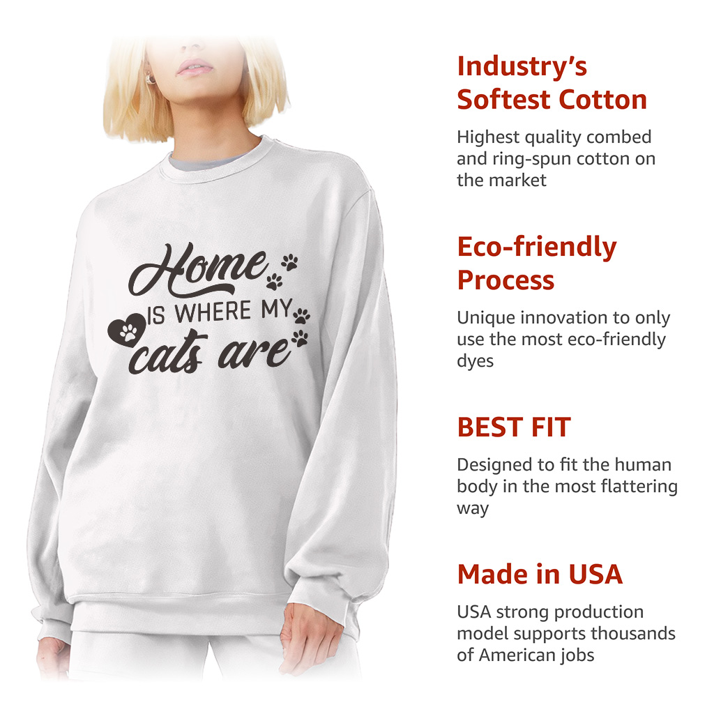 Home Is Where My Cats Are Sweatshirt is made from a 50% U.S. Cotton/50% Polyester blend, this warm 8.0 oz sq/yd classic fit style looks great and makes a great canvas for decorating. Home Is Where My Cats Are Sweatshirt is designed and printed in California.