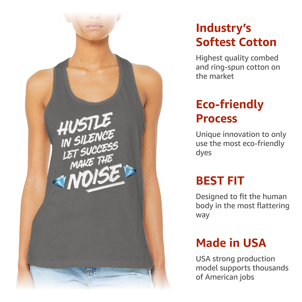 Hustle In Silence Let Success Make The Noise Racerback Tank is no ordinary piece of clothing. Its side-seamed detail and flatlock-finished hems provide a retail fit for clothing that’s true to size.