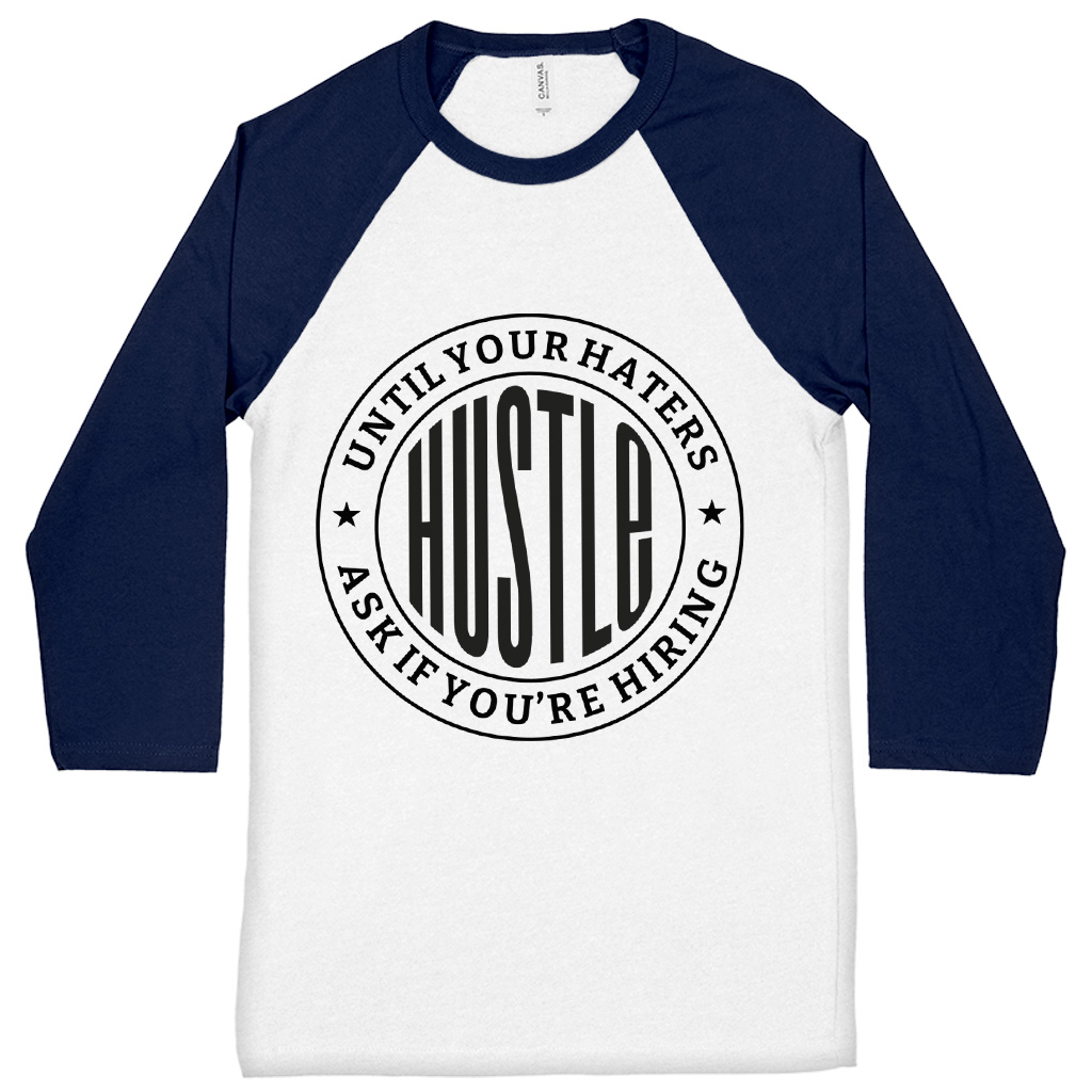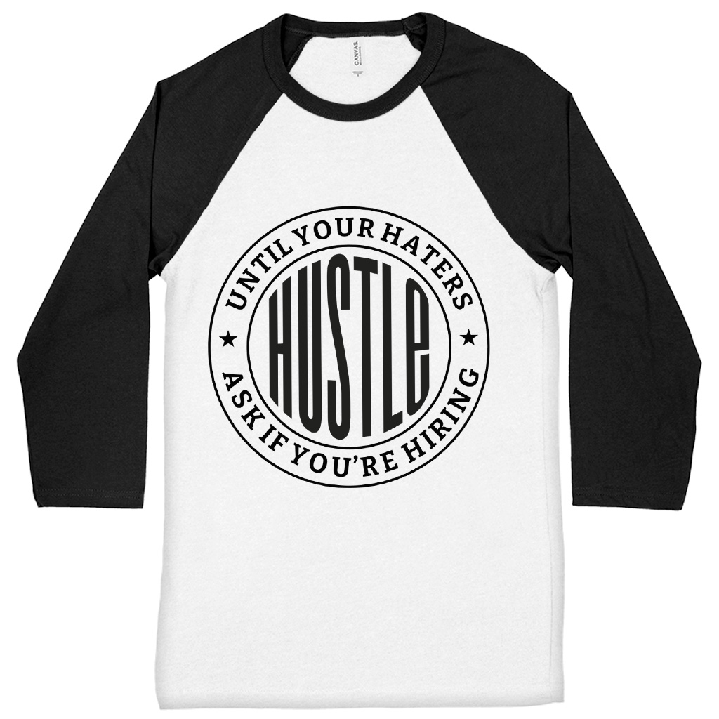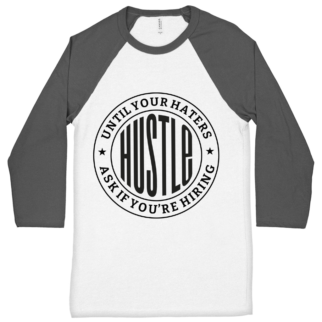 Hustle Until Your Haters Ask If You’re Hiring Baseball T-Shirt is proudly made with 7x less water than average manufacturers, in recycle-friendly facilities that also guarantee zero sweatshop conditions. Funny 3/4 Sleeve is designed and printed in California.