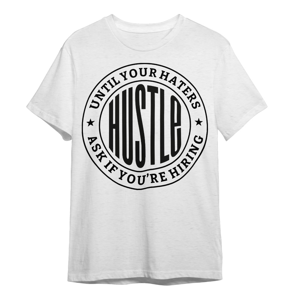 Hustle Until Your Haters Ask If You’re Hiring T-Shirt is no ordinary piece of clothing. Its taped neck and shoulders, double-needle sleeve and bottom hems, and quarter-turned construction provide a retail fit for clothing that’s true to size. Hustle and Grind Heavy Cotton Tee is Designed and printed in California.