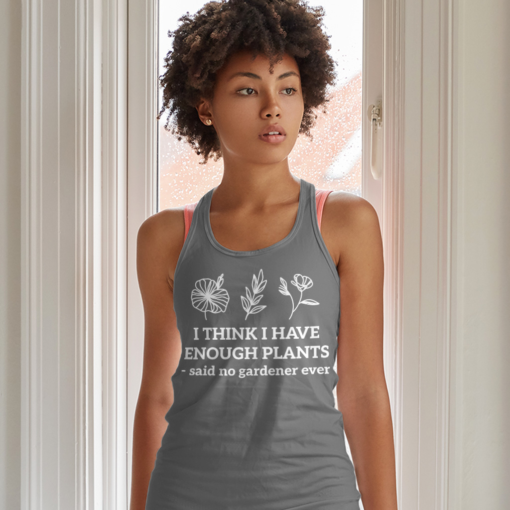 I Think I Have Enough Plants Racerback Tank is no ordinary piece of clothing. Its side-seamed detail and flatlock-finished hems provide a retail fit for clothing that’s true to size.