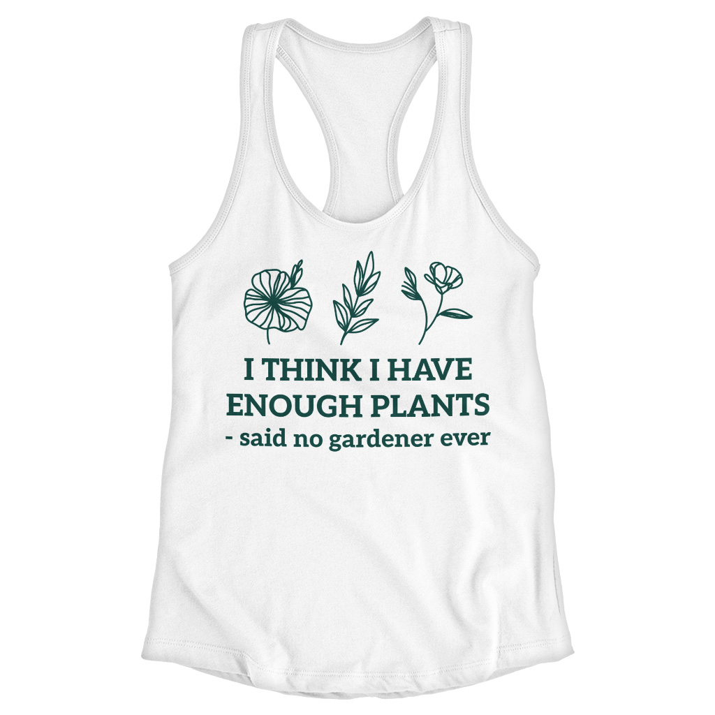 I Think I Have Enough Plants Racerback Tank is no ordinary piece of clothing. Its side-seamed detail and flatlock-finished hems provide a retail fit for clothing that’s true to size.