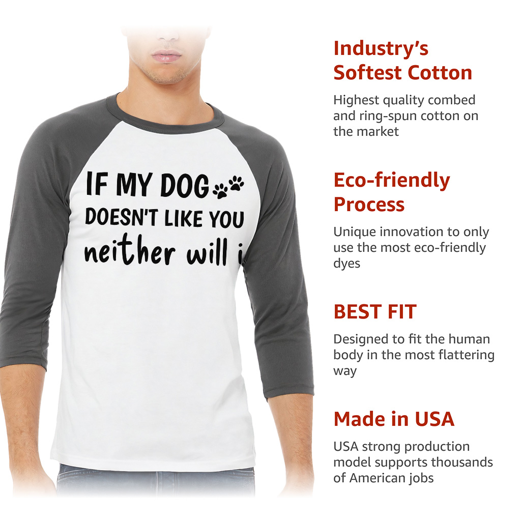 If My Dog Doesn’t Like You Neither Will I Baseball T-Shirt is proudly made with 7x less water than average manufacturers, in recycle-friendly facilities that also guarantee zero sweatshop conditions. Dog Love 3/4 Sleeve is designed and printed in California.