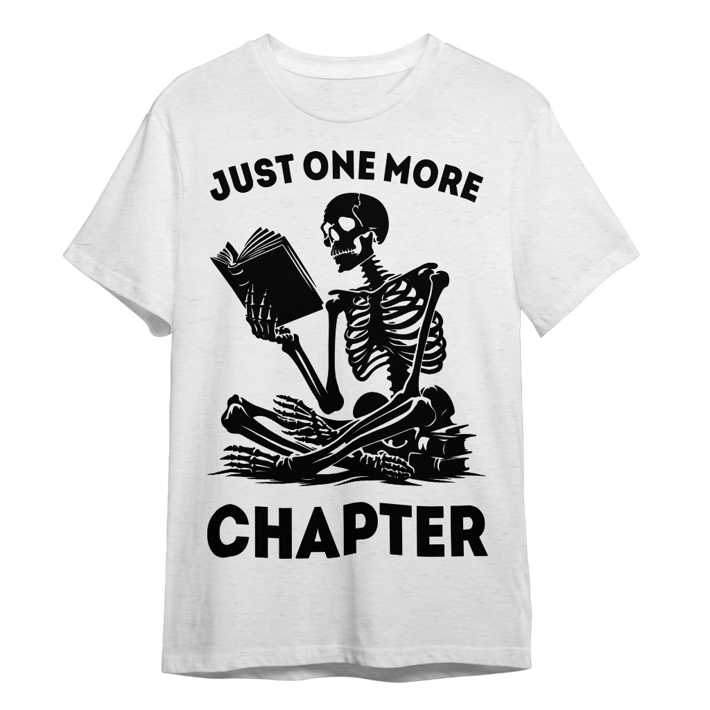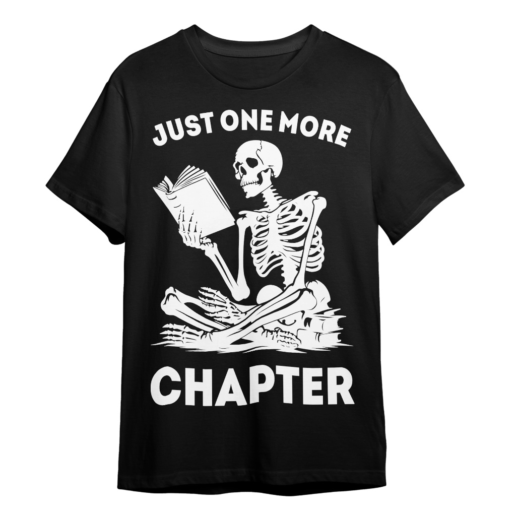 Just One More Chapter T-Shirt is no ordinary piece of clothing. Its taped neck and shoulders, double-needle sleeve and bottom hems, and quarter-turned construction provide a retail fit for clothing that’s true to size. Book Club Heavy Cotton Tee is Designed and printed in California.