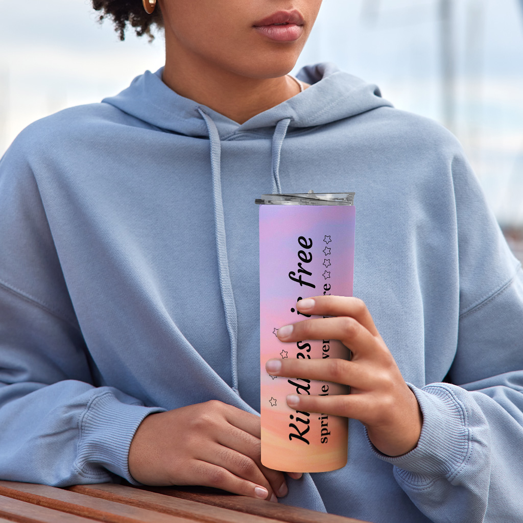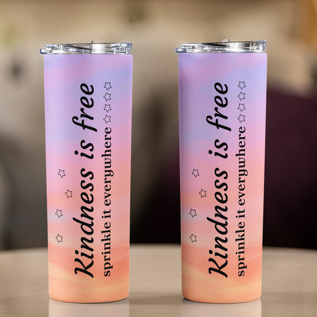 Each Kindness Is Free 20oz Skinny Tumbler has a non-slip rubber bottom to prevent the cup from colliding with the tabletop and making harsh noises, and to protect the bottom of the bottle from scratches and dents.