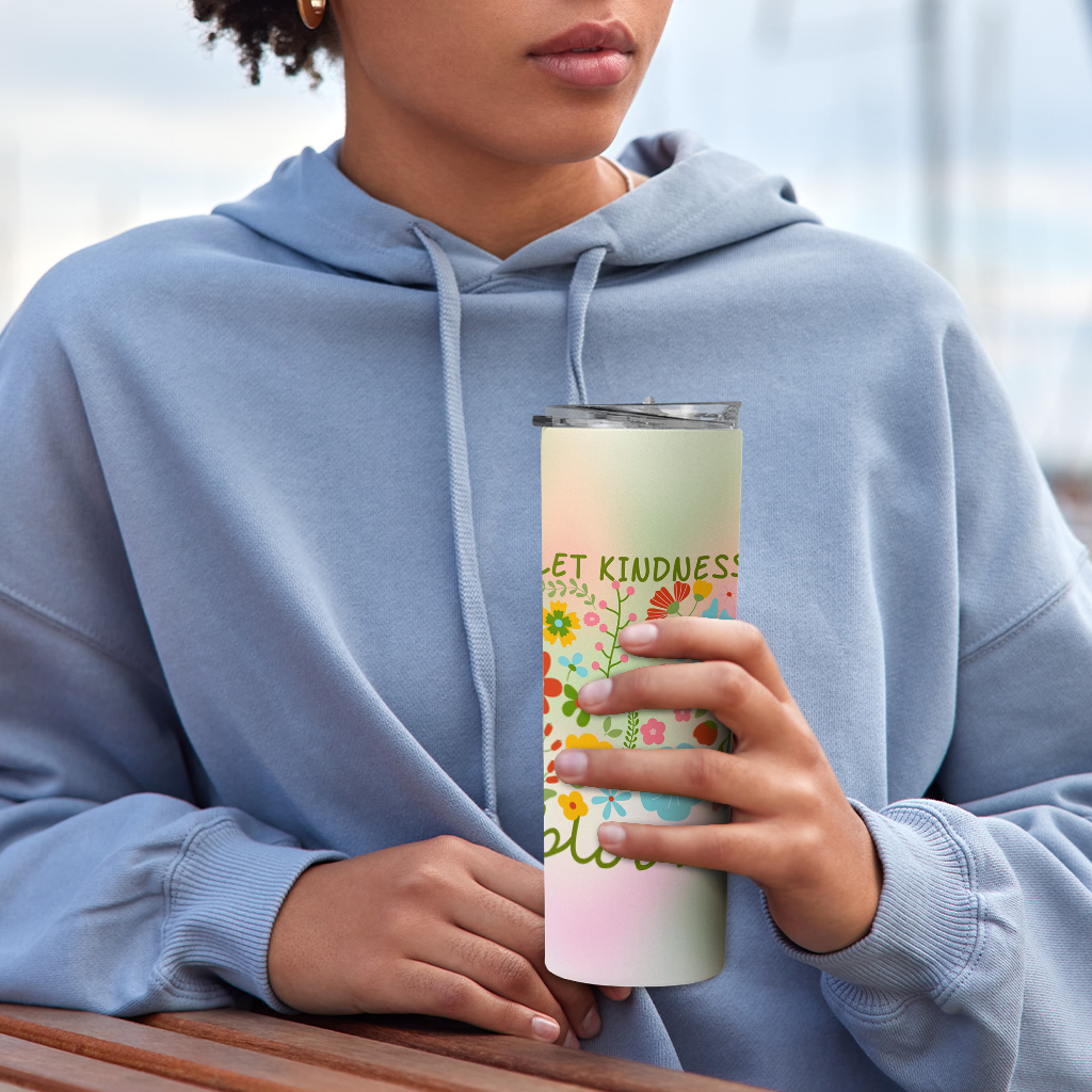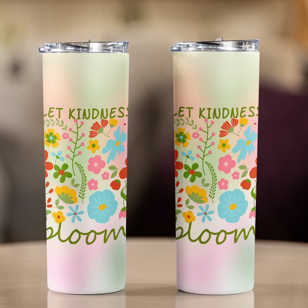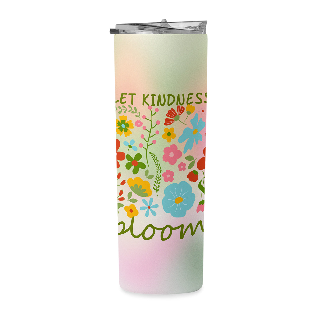 Each Let Kindness Bloom 20oz Skinny Tumbler has a non-slip rubber bottom to prevent the cup from colliding with the tabletop and making harsh noises, and to protect the bottom of the bottle from scratches and dents.