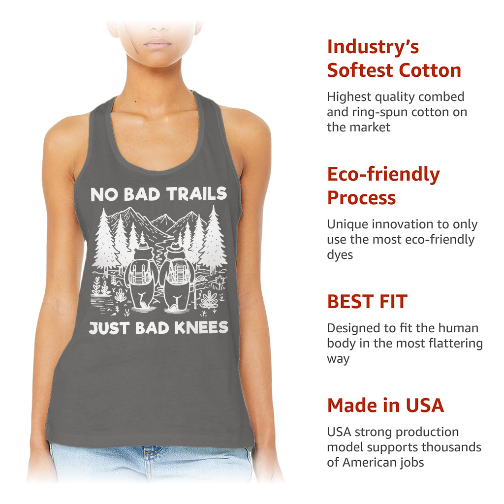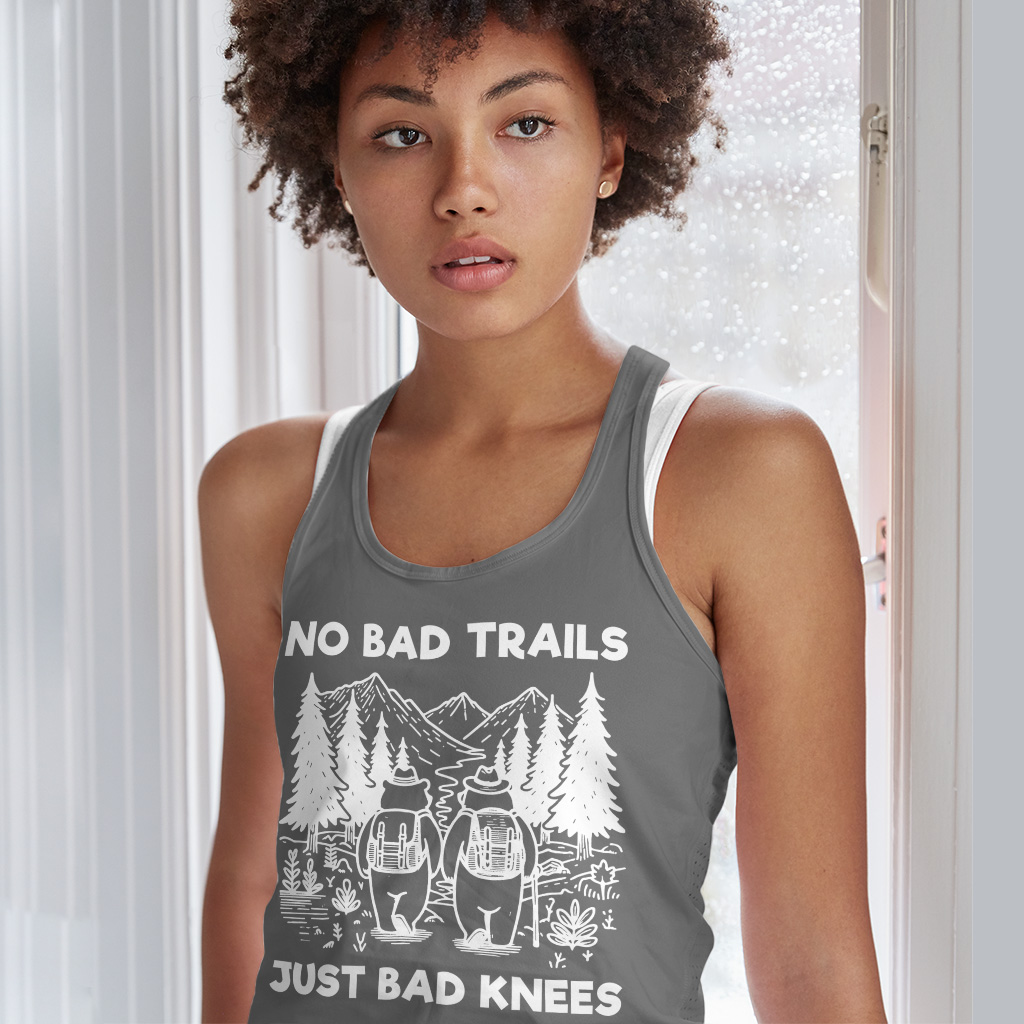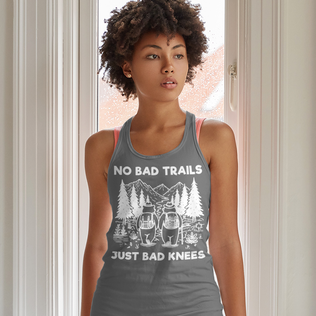 No Bad Trails Just Bad Knees Racerback Tank is no ordinary piece of clothing. Its side-seamed detail and flatlock-finished hems provide a retail fit for clothing that’s true to size.