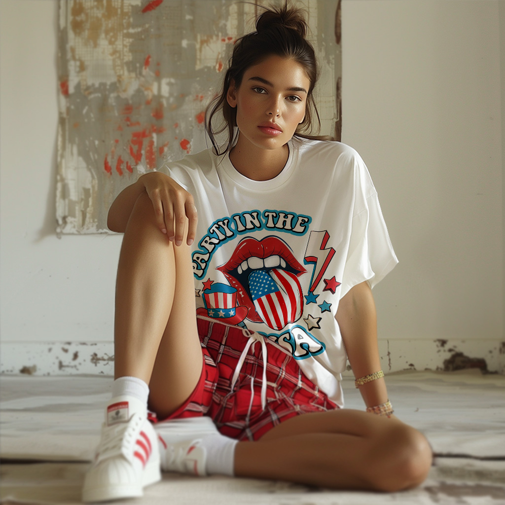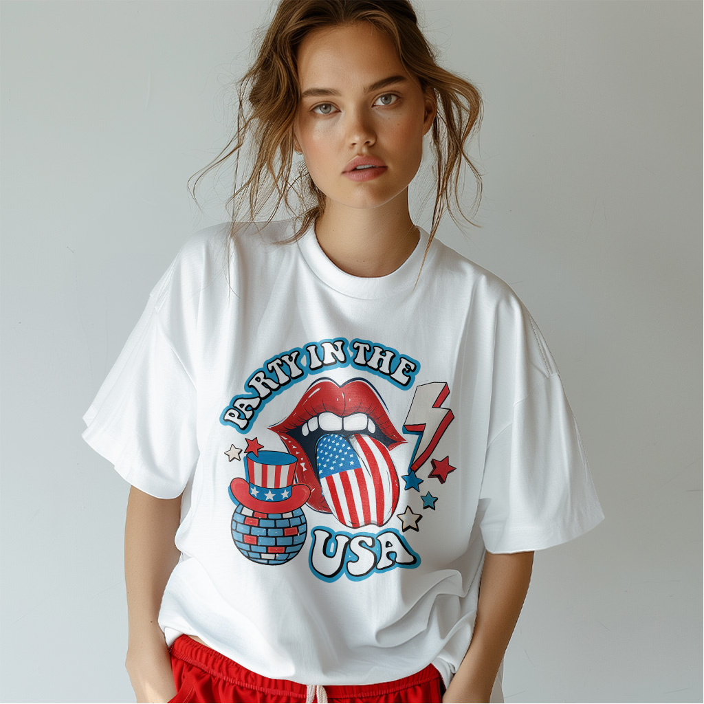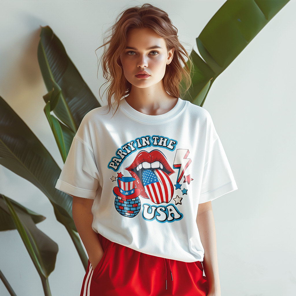 Party in The USA T-Shirt is no ordinary piece of clothing. Its taped neck and shoulders, double-needle sleeve and bottom hems, and quarter-turned construction provide a retail fit for clothing that’s true to size. Retro Graphic Heavy Cotton Tee is Designed and printed in California.