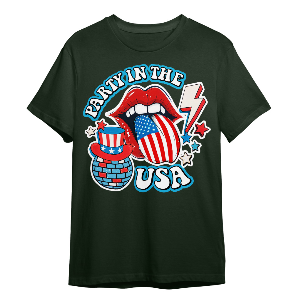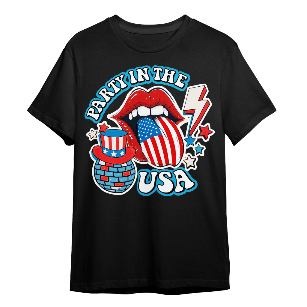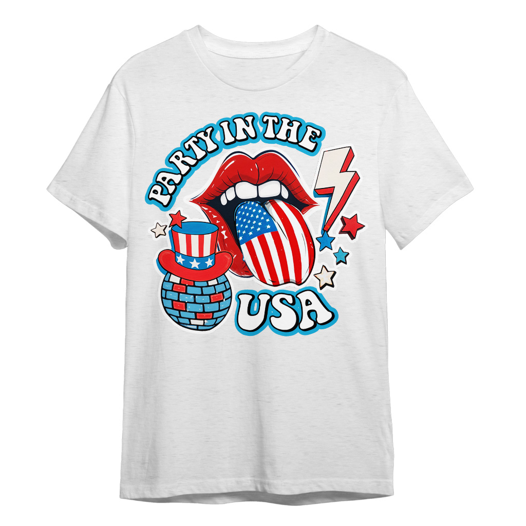 Party in The USA T-Shirt is no ordinary piece of clothing. Its taped neck and shoulders, double-needle sleeve and bottom hems, and quarter-turned construction provide a retail fit for clothing that’s true to size. Retro Graphic Heavy Cotton Tee is Designed and printed in California.