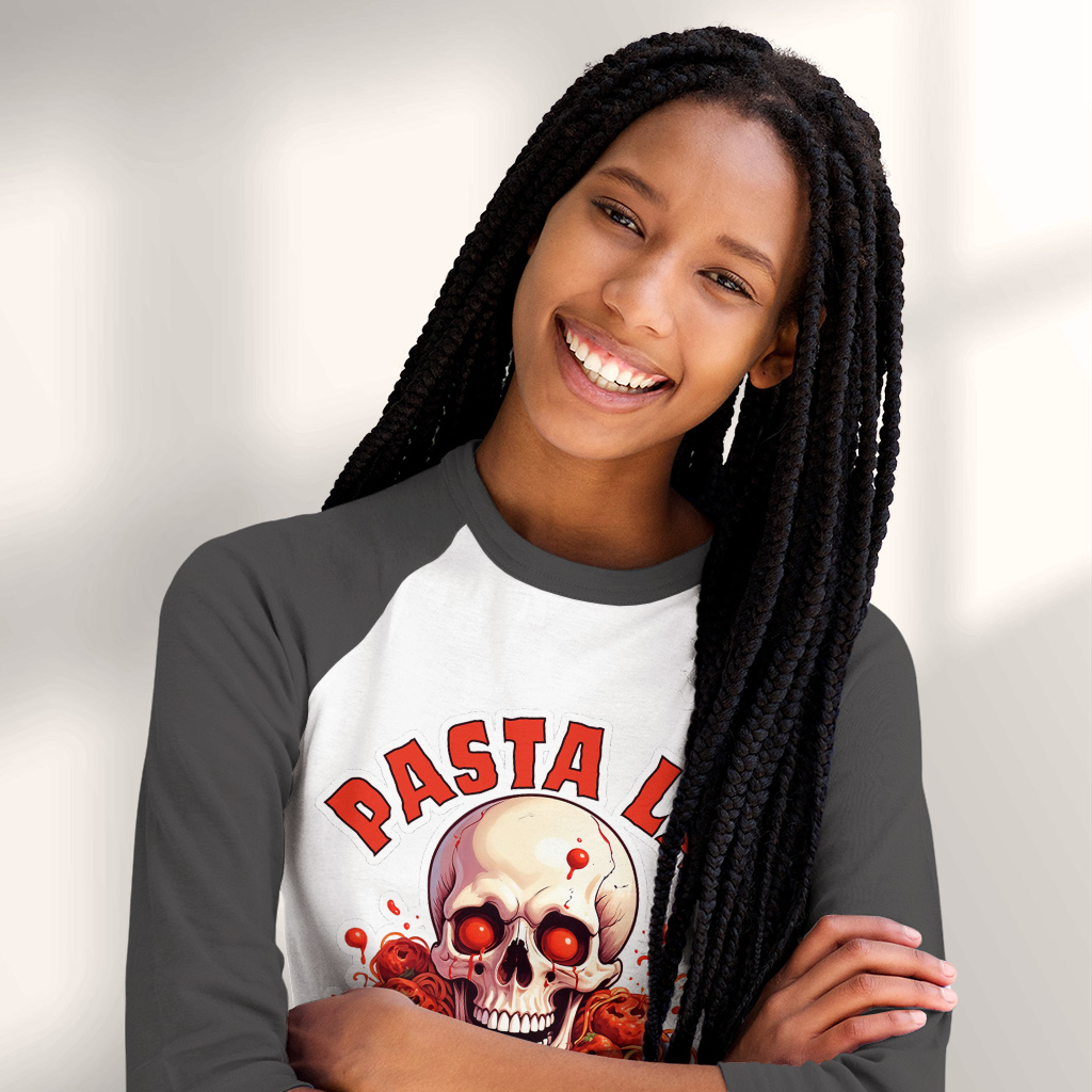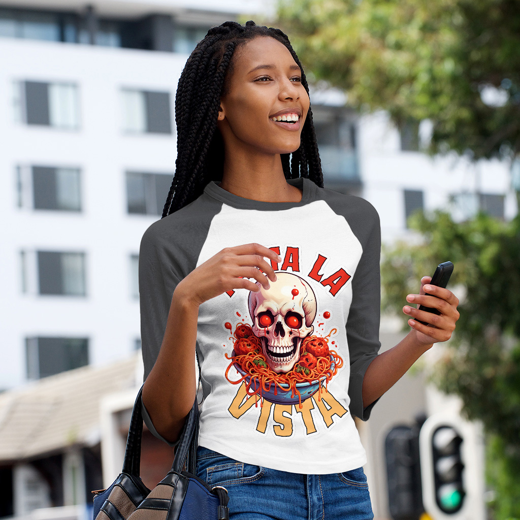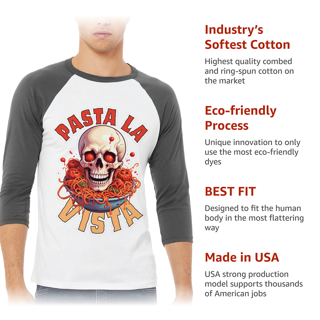 Pasta La Vista Baseball T-Shirt is proudly made with 7x less water than average manufacturers, in recycle-friendly facilities that also guarantee zero sweatshop conditions. Food Pun 3/4 Sleeve is designed and printed in California.