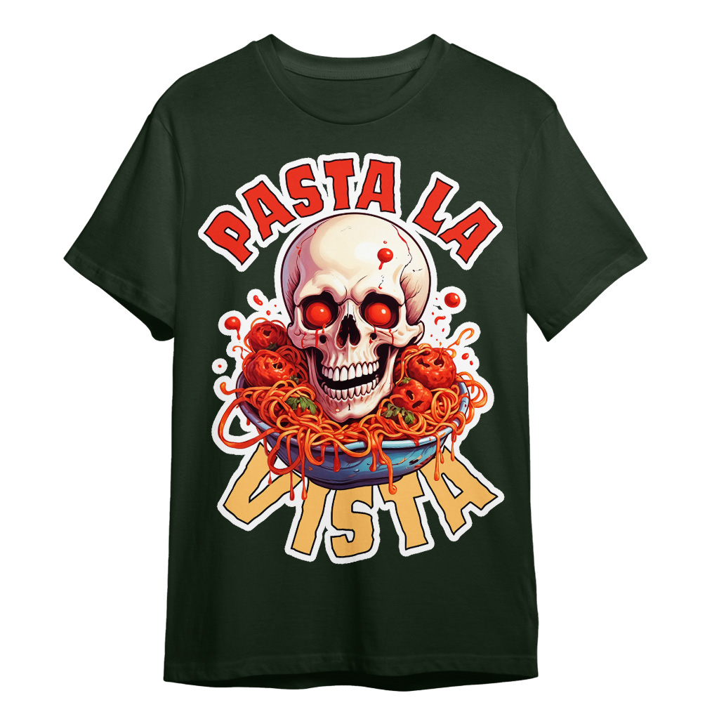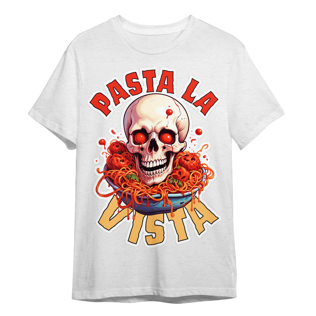 Pasta La Vista T-Shirt is no ordinary piece of clothing. Its taped neck and shoulders, double-needle sleeve and bottom hems, and quarter-turned construction provide a retail fit for clothing that’s true to size. Food Pun Heavy Cotton Tee is Designed and printed in California.