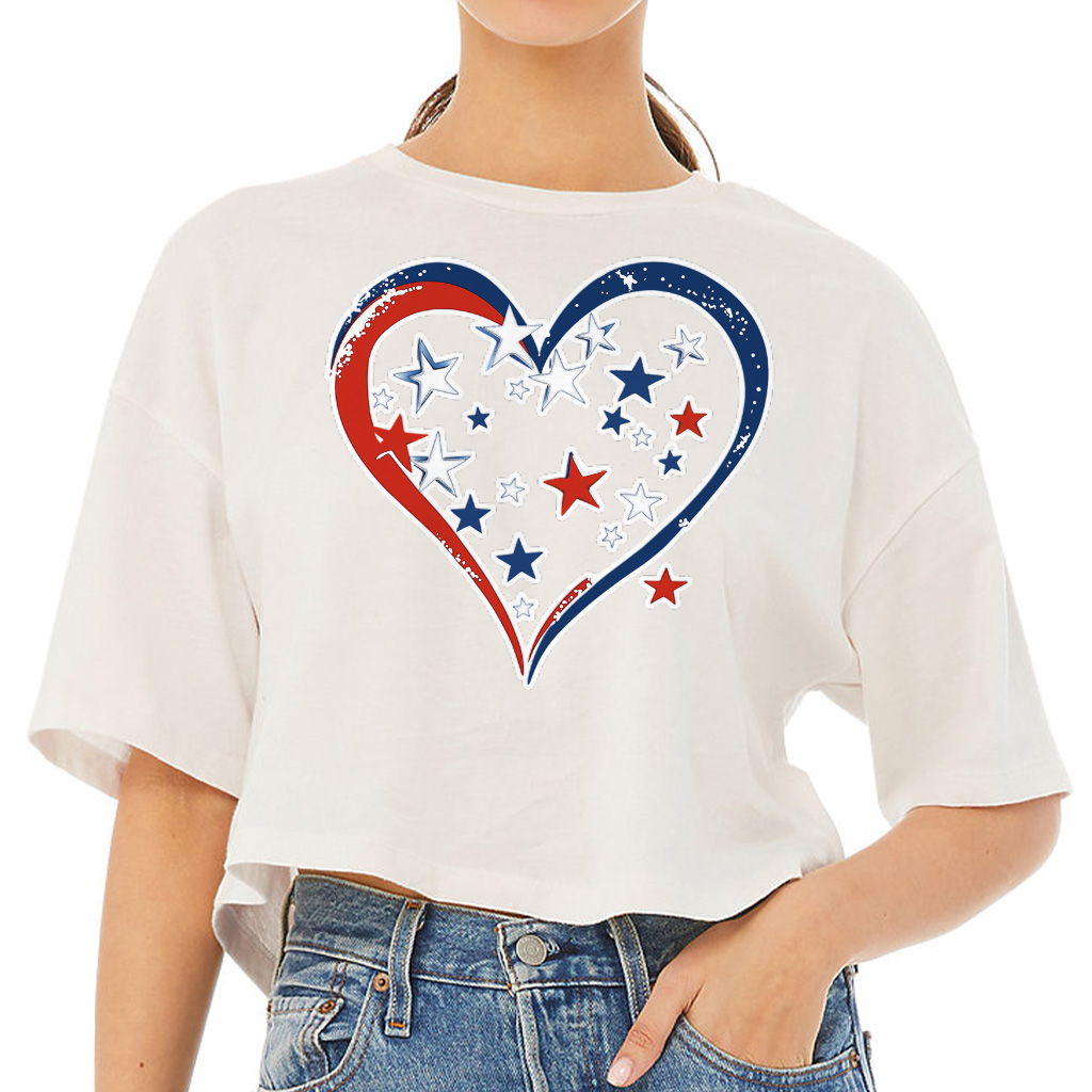 Red White Blue Heart Cropped T-Shirt – Cute USA Trendy Tee – USA Flag Women’s Basic T-Shirt