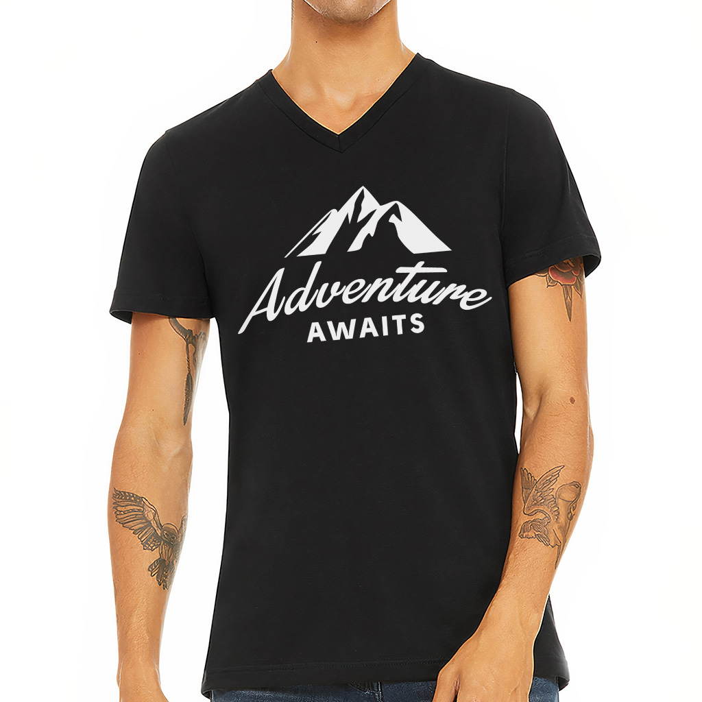 Adventure Awaits V-Neck T-Shirt – Camping Basic T-Shirt – Hiking Tee