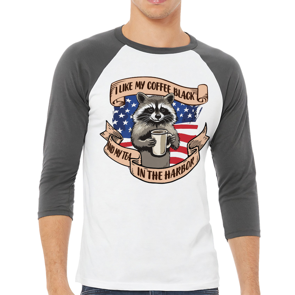 Tea in the Harbor Baseball T-Shirt – Cool Quote 3/4 Sleeve – Funny Raccoon Raglan Jersey Shirt